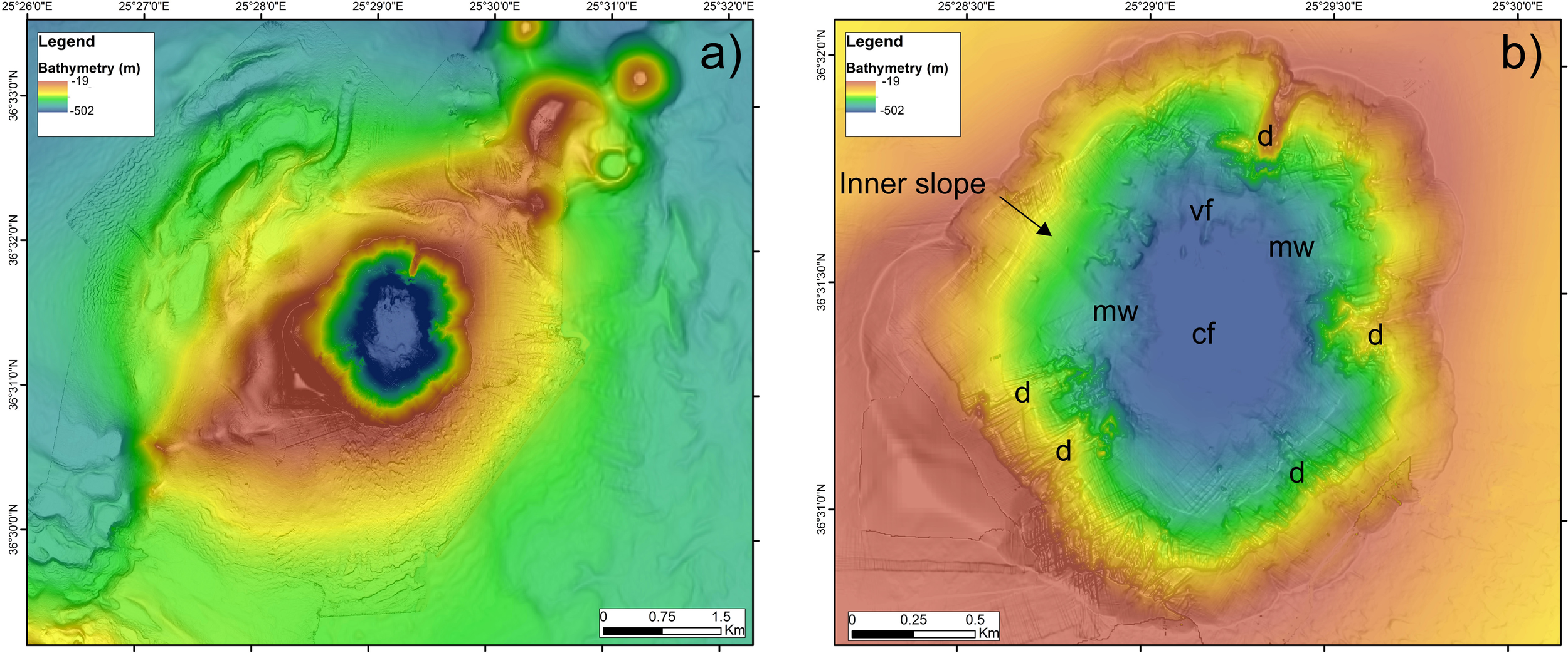 The first detailed bathymetric map of the Kolumbo volcano was produced in 2001 using the 20 kHz SB2120 swath system on R/V Aegaeo (Nomikou et al., 2012; Nomikou et al., 2013). More recently in 2015, bathymetric data were also acquired on-board the R/V Marcus Langseth using the Simrad Kongsberg EM122, 12 kHz multibeam echo sounder. In 2017, high-resolution AUV (Autonomous Underwater Vehicle) data were collected during POS510 cruise, in 7 missions of AUV Abyss (GEOMAR) (Hannington, 2018), under the framework of the collaborative project “ANYDROS: Rifting and Hydrothermal Activity in the Cyclades Back-arc Basin” (Figure 2). The AUV mapping allows a 2m resolution that can identify seafloor geomorphological features that are not visible in conventional ship-based multibeam data. The new bathymetric map of Kolumbo volcano (Nomikou et al., 2019b) reveals: a) the abrupt inner slopes of Kolumbo crater, b) the almost flat seafloor surrounding the active vent field at the northern part of the crater floor (485 m depth) c) dykes exposed in the inner slopes, d) the mass-wasting deposits in the inner slopes, e) the curvilinear scarps with inward dipping faces at the W-NW rim of the crater.
