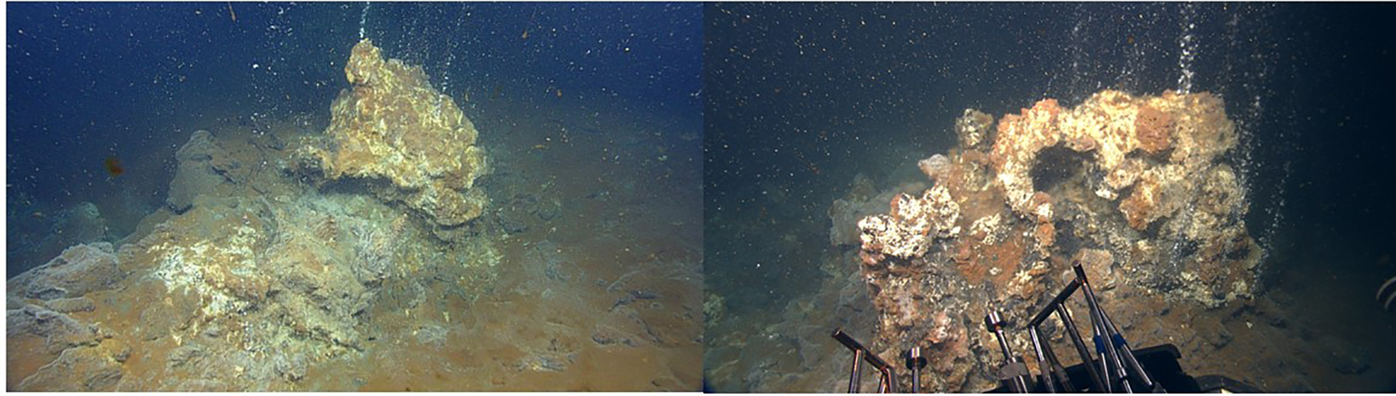 Figure 3 ROV captured photos (E/V Nautilus Leg NA-007) (Carey et al., 2011) of active high–temperature (max 265°C) Kolumbo hydrothermal sulfide mounds, vigorously discharging boiling fluids and gases (>99% CO2) (Carey et al., 2013b; Kilias et al., 2013).