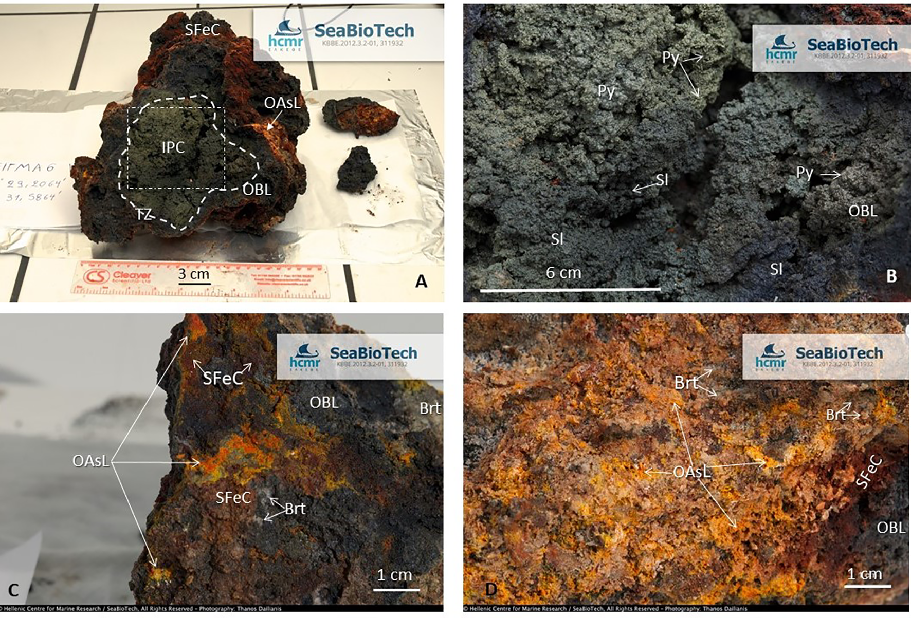 Figure 4 Ex situ photographs of a typical recovered Au-rich SMS chimney (Au up to 32 ppm; Au/(Cu+Zn+Pb) = 1.9), enriched in potentially toxic, volatile metal(loid)s (As, Sb, Pb, Ag, Hg, Tl) (VTML), Kolumbo hydrothermal vent field (Kilias et al., 2013). All sulfide phases are variably enriched in Au and VTML. (A). Basal cross section of chimney showing typical pattern of sulfide phase zonation. (B) Enlargement of the squared area of (A), showing the IPC texture that is dominated by fine-grained botryoidal masses of pyrite surrounding fluid flow channels. (C, D). Outermost skin of the OBL (dark bluish-black), composed of patches with red, orange, and yellow auriferous orpiment-, and realgar-, like phases (OAsL), associated with barite; these As-phases show evidence of oxidative weathering in the form of local, dark brown SFeC. Py, Auriferous As-pyrite; Brt, barite; Sl, polymetallic sulfide aggregates; IPC, Inner Pyrite Core; OBL, Outermost Barite Layer; TZ, Transition Zone; OAsL, Outer As-rich Layer; SFeC, Surface Fe-oxyhydroxide rich Crust. “SeaBioTech” EU-FP7 project (Grant No. 311932), are thanked for funding the sampling.