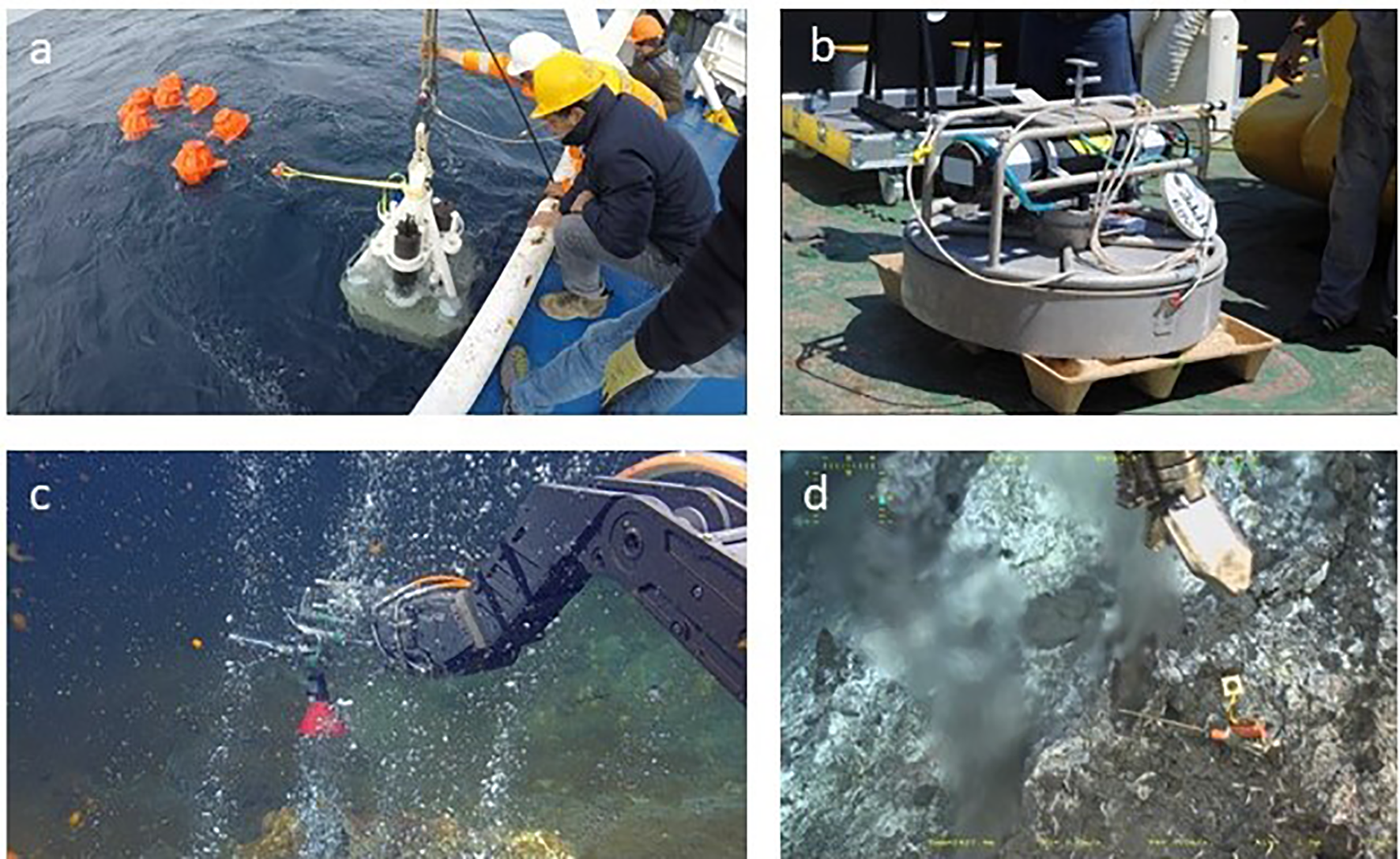 vi) In addition to variations in CO2, H2S, and O2, we expect measurable fluxes of radon and/or thoron commonly associated with volcanic emissions (Jamieson et al., 2013; Hwa and Kim, 2015; de Ronde et al., 2019; Neuholz et al., 2020; Klose et al., 2021). A prototype underwater γ–radiation spectrometer will be developed for operation on the seafloor observatory to monitor these fluxes together with other physical and chemical data. In addition to stand-alone detectors, SANTORY will deploy γ–detectors on ROV to provide real–time, in situ monitoring of radioactivity levels near the vents. In addition to monitoring dynamics of radon/thoron emanation from the volcanic vents, several applications for the instruments are envisioned, including radioisotope tracing experiments, (e.g., correlation of radiotracers to seismicity/venting), subseafloor hydrogeological studies, and sediment dating (Jamieson et al., 2013; de Ronde et al., 2019; Neuholz et al., 2020; Klose et al., 2021). The main effort in SANTORY is to introduce new types of detectors that are smaller, more efficient and less power–consuming, to offer continuous monitoring and new opportunities for scaling up the design and interoperability with other instruments.