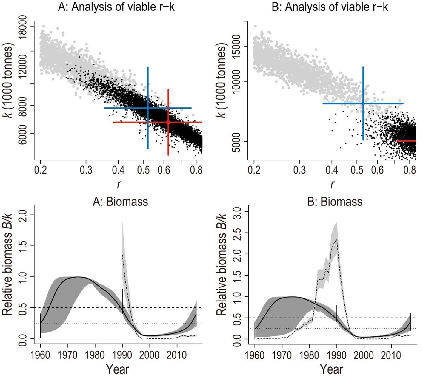 As Mi2021 did not indicate which optimal r-k pairs were used in their analyses, and did not mention the resulting fit of the model they used (Supplementary Figure 2), it is difficult to compare their results with those that we obtained. Additionally, we worry that Mi2021's remarks about the use of full time series irrespective of the model assumptions, the modeling emphasis, and the degree of model fitting, may underestimate the power of BSM assessments in data limited conditions or when incomplete abundance data are applied.