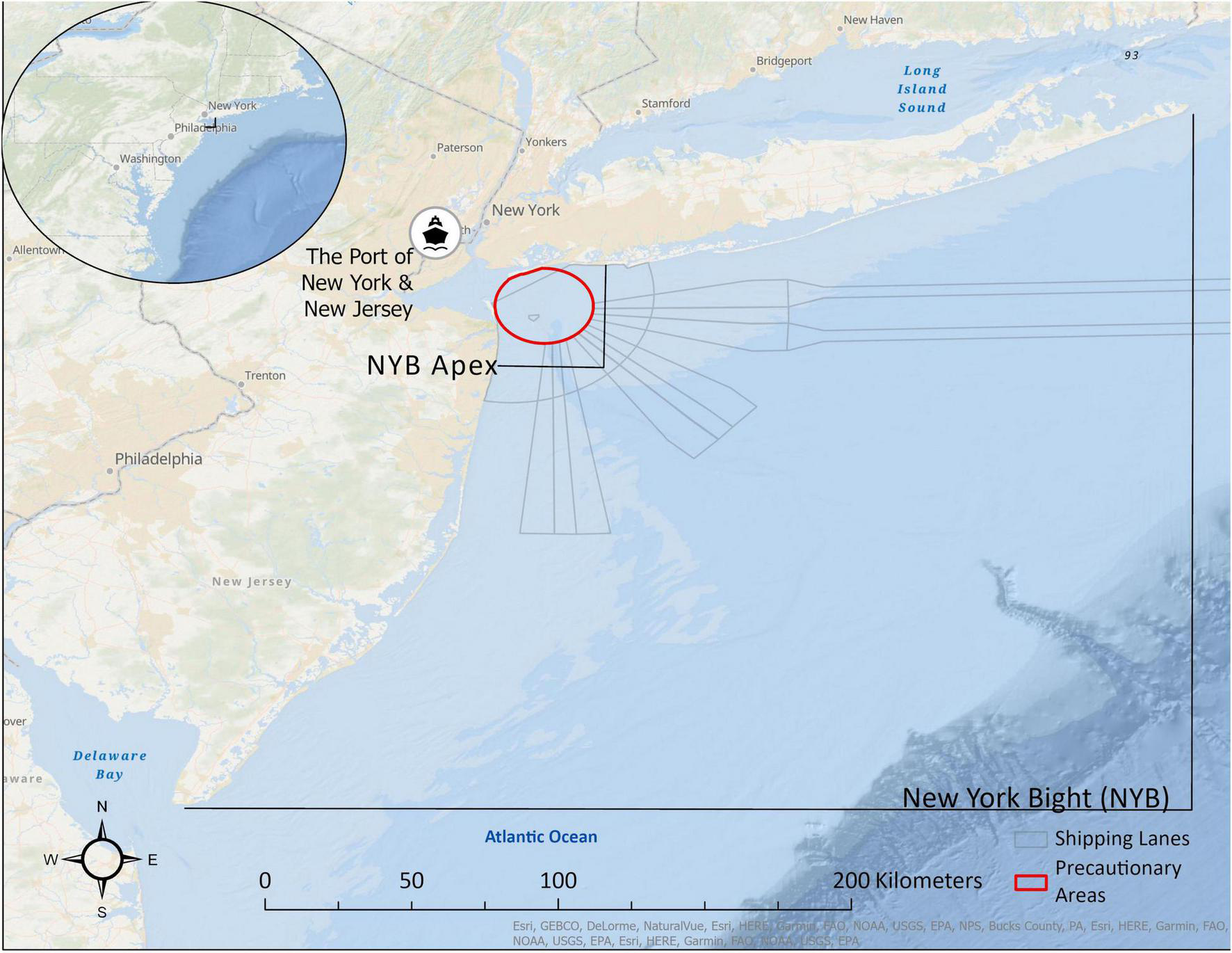 Locations of the Port of New York and New Jersey, the New York Bight, commercial shipping lanes and precautionary areas, and the New York Bight Apex. Sources: Esri, GEBCO, NOAA, National Geographic, DeLorme, HERE, Geonames.org, and other contributors (Esri, 2022a,b).
