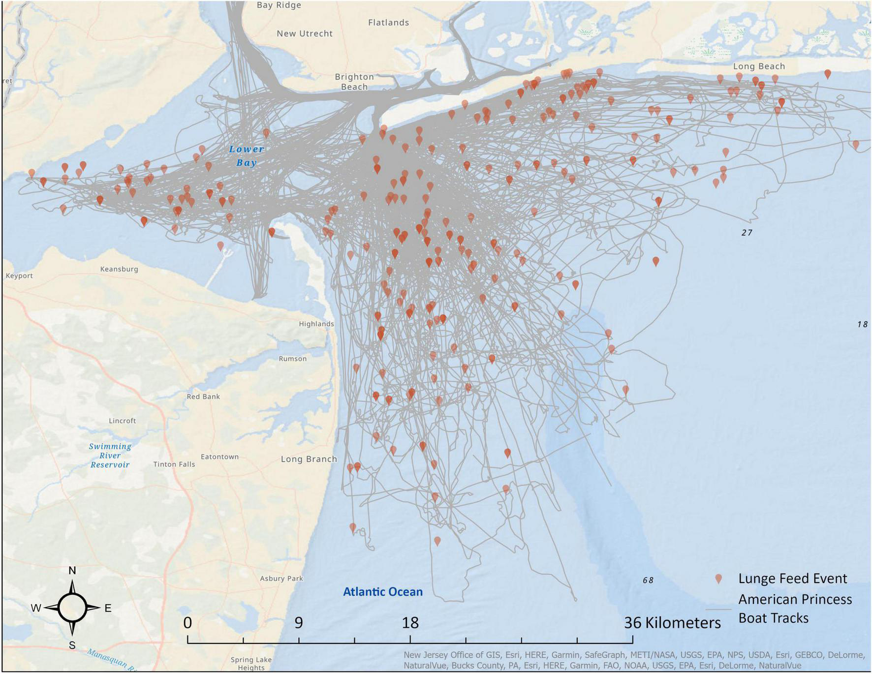 ArcGIS Pro version 2.7 was used to spatially assess the lunge feed locations (Esri Inc., 2020). Data were projected in the coordinate system for Long Island (NAD 1983 New York Long Island State Plane Projection FIPS 3104 Meters). All maps in this research were made using ArcGIS® software by Esri. ArcGIS® and ArcMap™ are the intellectual property of Esri and are used herein under license. Copyright © Esri. All rights reserved. For more information about Esri® software, please visit www.esri.com.