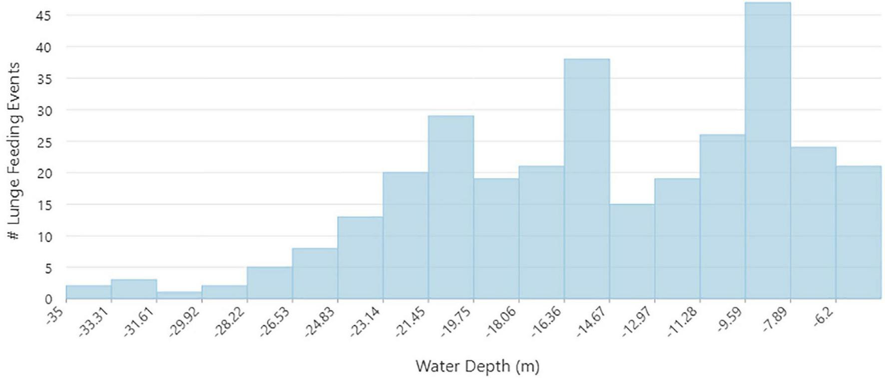 Distribution of water depths for each lunge feeding event (2011–2019).
