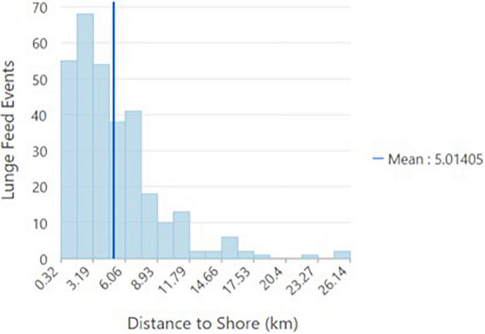Two hundred and eighty-three lunge feed locations (90%) were less than 10 km from shore. The minimum distance from shore was 0.32 km, while the maximum distance from shore was 26.14 km (Figure 5). The average distance from shore is 5.01 km. For the boat tracks, the average distance from shore was also 5.01 km.