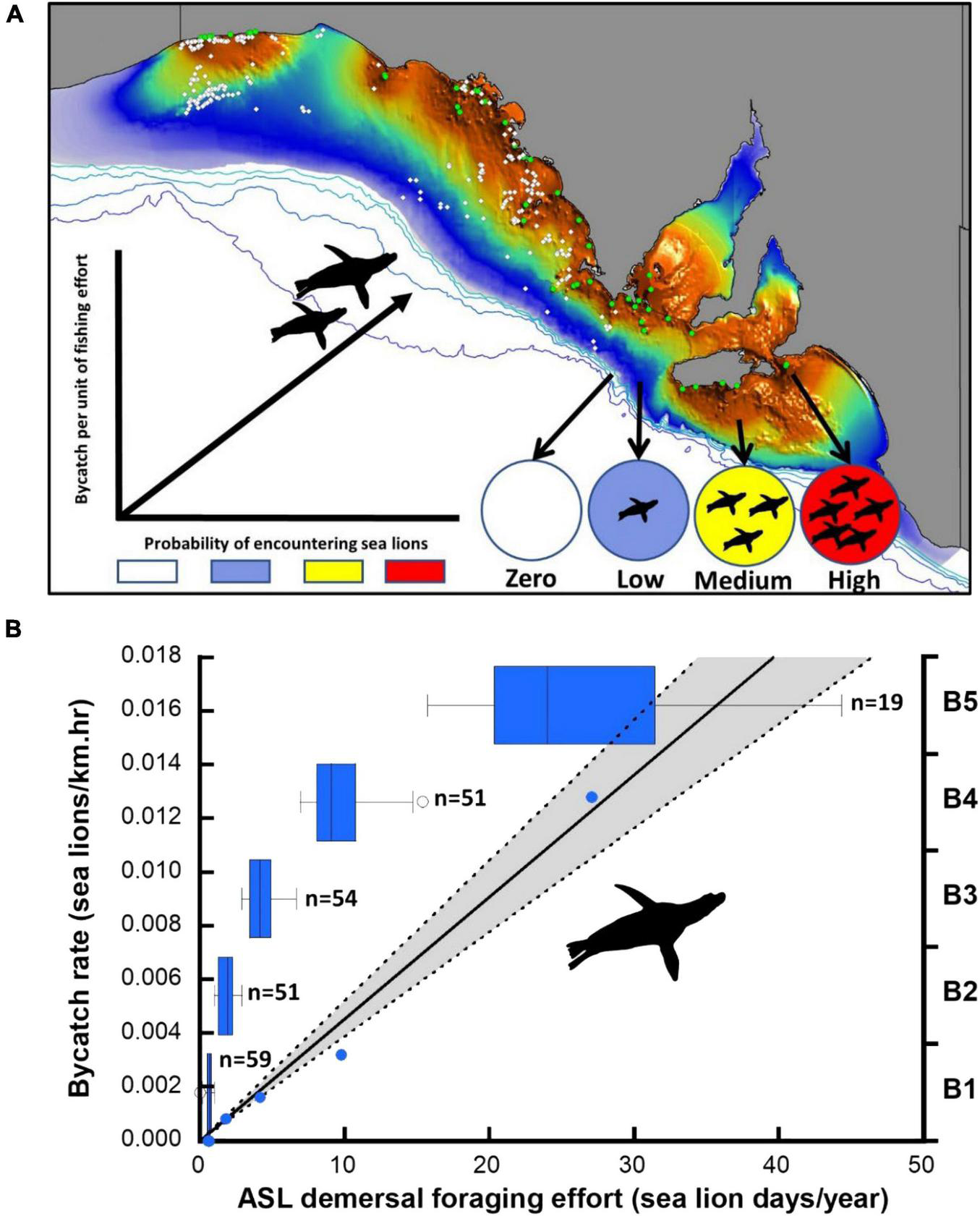 Bycatch rate (numbers of animals caught per unit of fishing effort) is a common metric used to estimate the level of bycatch to which a species is subjected (Sims et al., 2008; Moore et al., 2021). Bycatch models may be improved, however, by incorporating geographic information on species distribution at sea (e.g., species distribution models) and distribution of fishing effort, as bycatch rates are often highly heterogeneous. ASLs are good candidate species for this approach because they are a non-migratory, breed colonially, undertake regular foraging trips to sea and show strong philopatry to natal breeding sites (Campbell, 2003; Kirkwood and Goldsworthy, 2013). Furthermore, ASL display a high degree of faithfulness to foraging locations and foraging modes, with individuals settling on a mode of foraging at a very young age (Lowther et al., 2011, 2012, 2013). ASLs are demersal foragers and dive continuously to the seabed throughout foraging trips (Kirkwood and Goldsworthy, 2013).