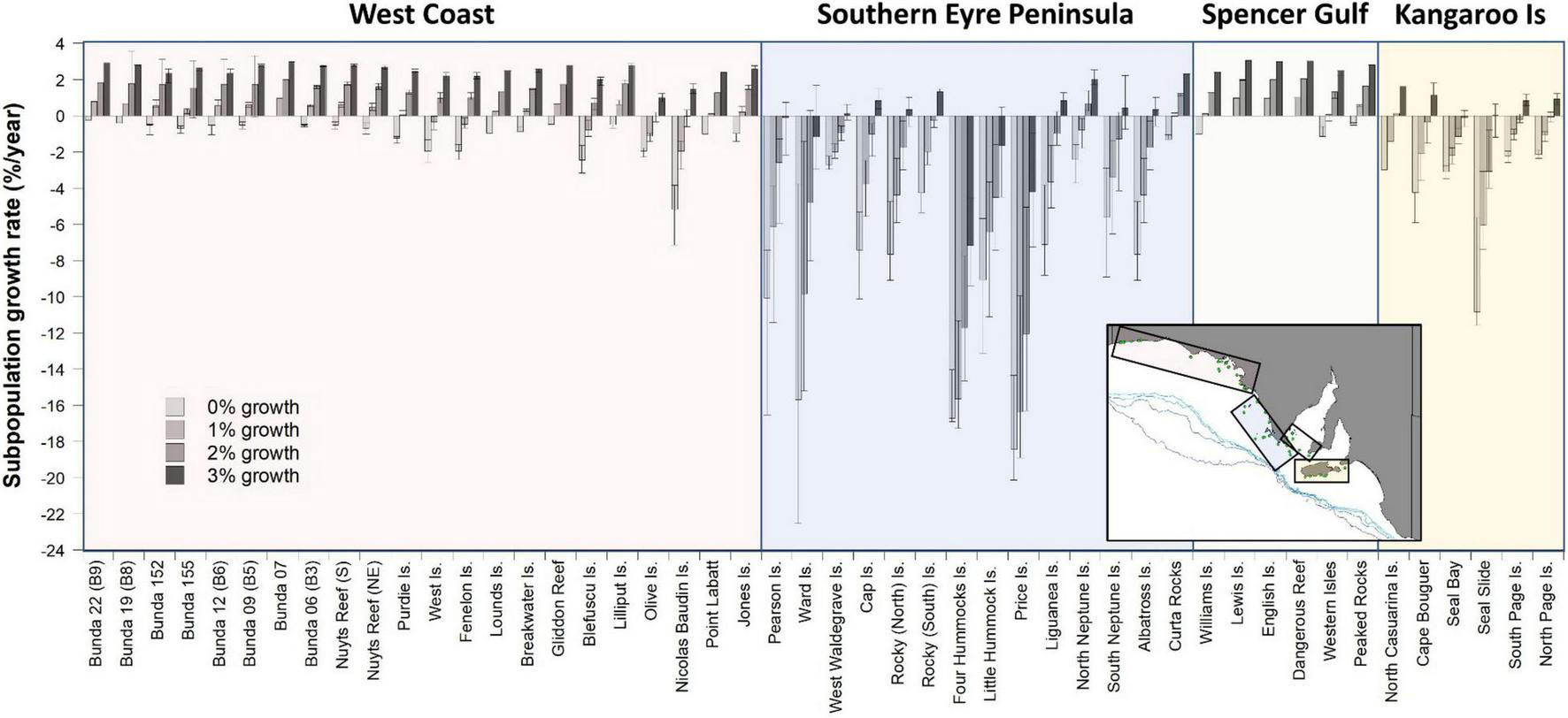 Population viability analyses incorporating Leslie matrix data for the Seal Bay subpopulation (Supplementary Table 4; Goldsworthy et al., 2020) were used to model changes in the abundance of all ASL subpopulations in SA through time, using the RAMAS® Metapop software (Version 3.0, Applied Biomathematics, Setauket, New York; Akçakaya, 1998). Only the female part of each subpopulation was modeled, so the estimated numbers in the first stage (pups) equaled half of the estimated pup production (assuming 1:1 sex-ratio at birth, Supplementary Table 1). Final stage survival rates were set to zero, with a standard deviation of 0.01 for all stage survival and fecundity estimates to provide a measure of environmental stochasticity (Akçakaya, 1998).