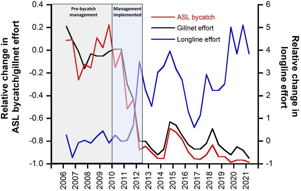 Annual fishing effort in the gillnet sector of the GHAT fishery off SA increased from around 3,000–12,000 km of net-set per year between 1973 and 1983, then to 43,000 km net-set in 1987. Fishing effort then decreased annually to about 23,000 km net-set in 1993 then increased to just over 32,000 km net-set in 1998. Annual fishing effort reduced in 2000 and remained at about 19,000 km net-set through to 2010, before declining to ∼3,000 km net-set to the end of June 2021 (most of this east of 139° longitude, i.e., outside of the ASL Management zones, see below) (Supplementary Figure 3).