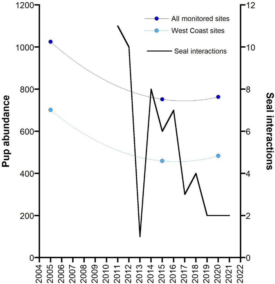 In response to these findings, the Australian Fisheries Management Authority (AFMA) introduced the Australian Sea Lion Management Strategy in June 2010 (Australian Fisheries Management Authority, 2010). Most of the core management measures in the Strategy were developed and refined in stages between 2010 and 2012 and included the introduction of an independent observer program, permanent spatial gillnet closures around all sea lion breeding sites, bycatch mortality limits that triggered temporal spatial closures, and incentives to switch to alternate fishing methods (longlines). The objectives of these measures were directed toward enabling the recovery of the species including all subpopulations (Australian Fisheries Management Authority, 2010). The Strategy has now been in place for over a decade, but its success in mitigating sea lion bycatch and enabling the recovery of affected populations has not been assessed.