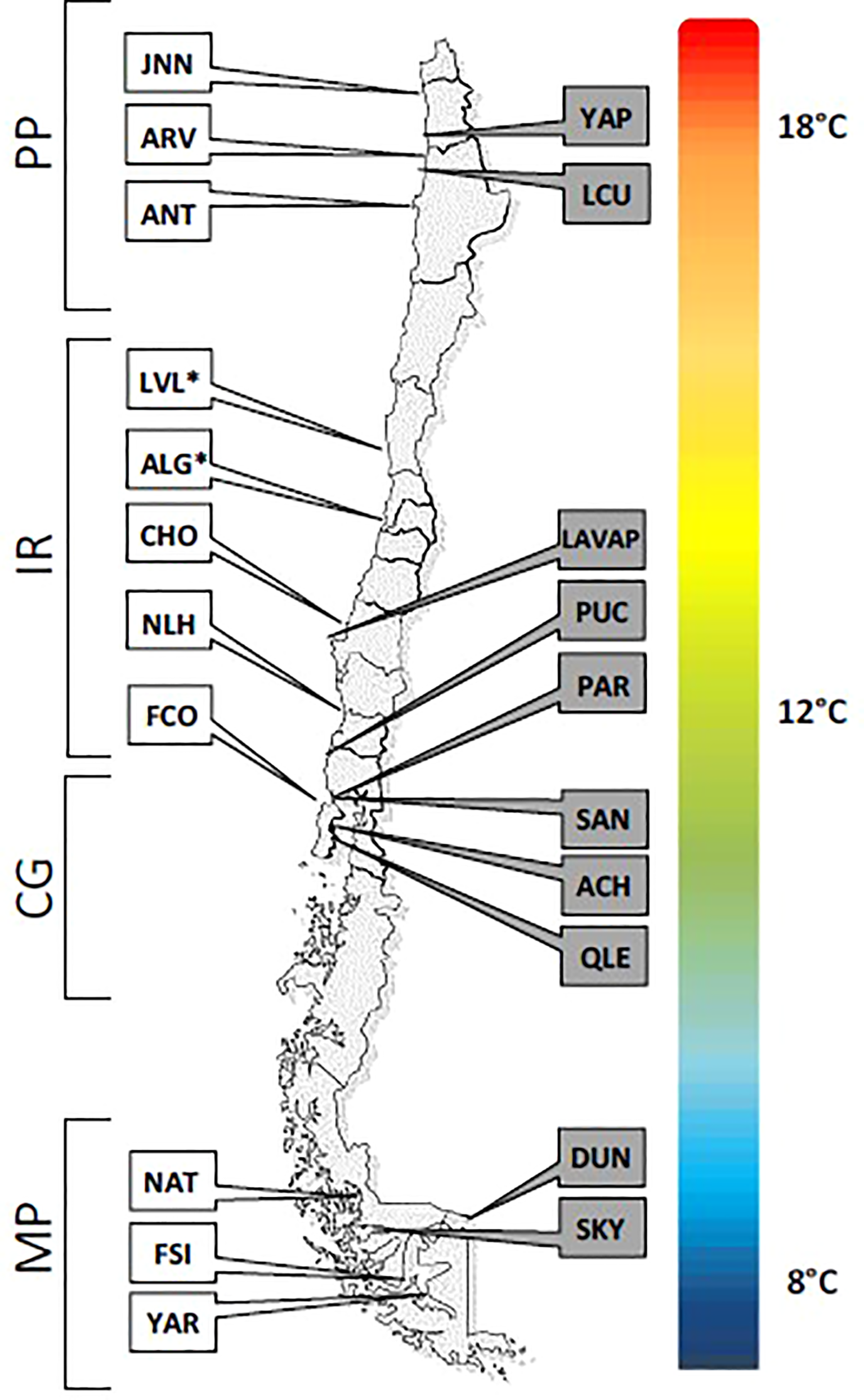 Distribution of the sampling locations within the three biogeographic regions. All sites (except LVL* and ALG*) were included in experiment 1. Experiment 2 included all populations indicated on the left of the map. The colored gradation indicates the latitudinal gradient of coastal temperatures. MP, Magellan Province (average temperature of 8°C); CG, Corcovado Gulf (average temperature of 12°C); IR, Intermediate Region (average temperature of 12°C) and PP, Peruvian Province (average temperature of 18°C).