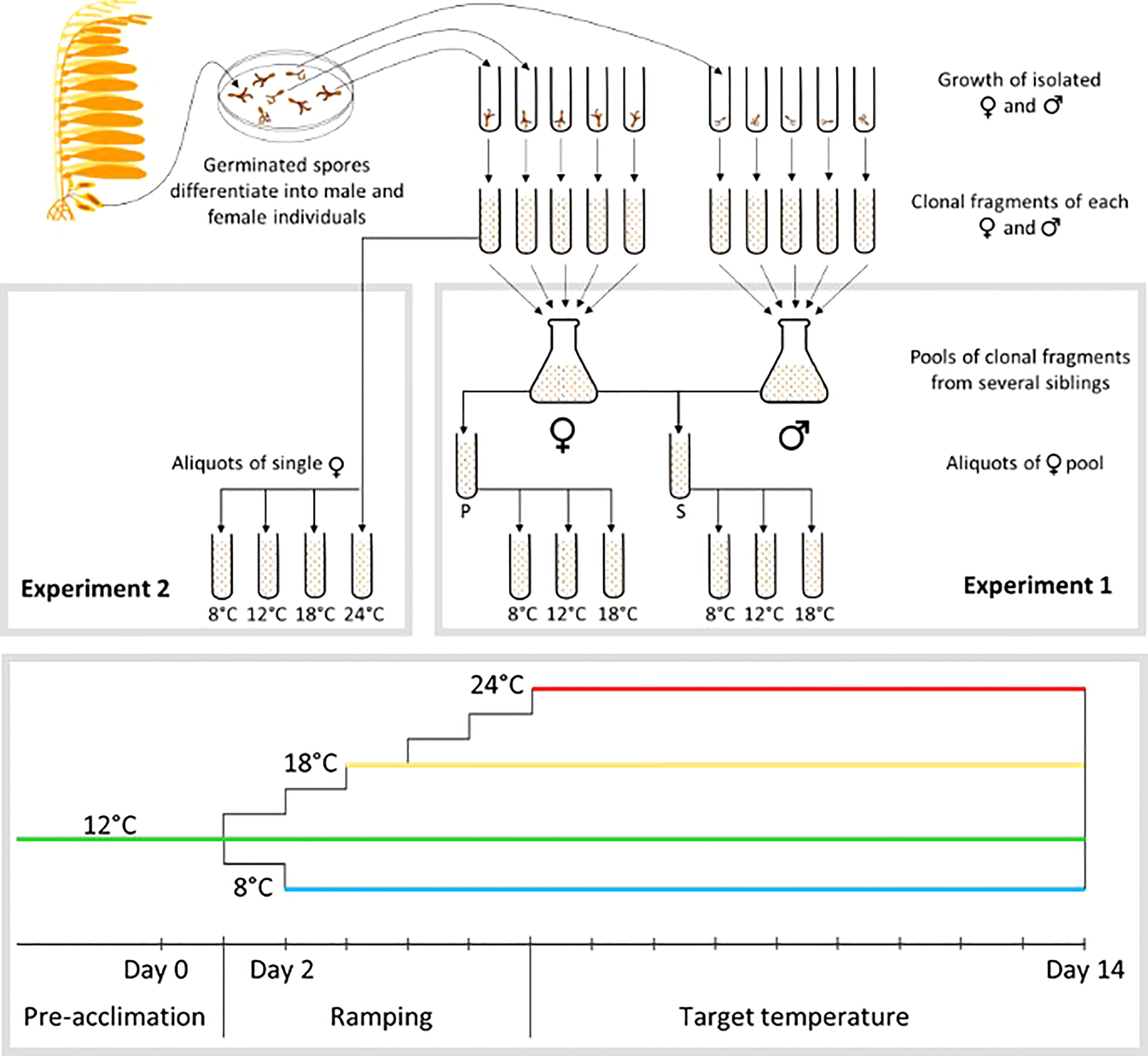 Upper part: Experimental design for the isolation and manipulation of gametophytes. Initially, spores were collected from sporophylls (i.e. specialized blades located at the base of the sporophyte) and cultivated until male and female could be recognized. Individual gametophytes were then isolated and cultivated separately, and then fragmented into fragments of 5-15 cells. In Experiment 1, pools of clonal fragments from 5 sister females were split in 2 aliquots, one left without males to induce parthenogenesis (P), the other mixed with a pool of 5 males issued from the same parental sporophyte to induce self-fertilization (S). Each of these pools were then split in 3 aliquots, each aliquot being submitted to a different temperature. In Experiment 2, clonal fragments of single females were separated in 4 aliquots, each aliquot then submitted to a different temperature. Lower part: work flow for temperature changes between pre-acclimation conditions to target temperature.