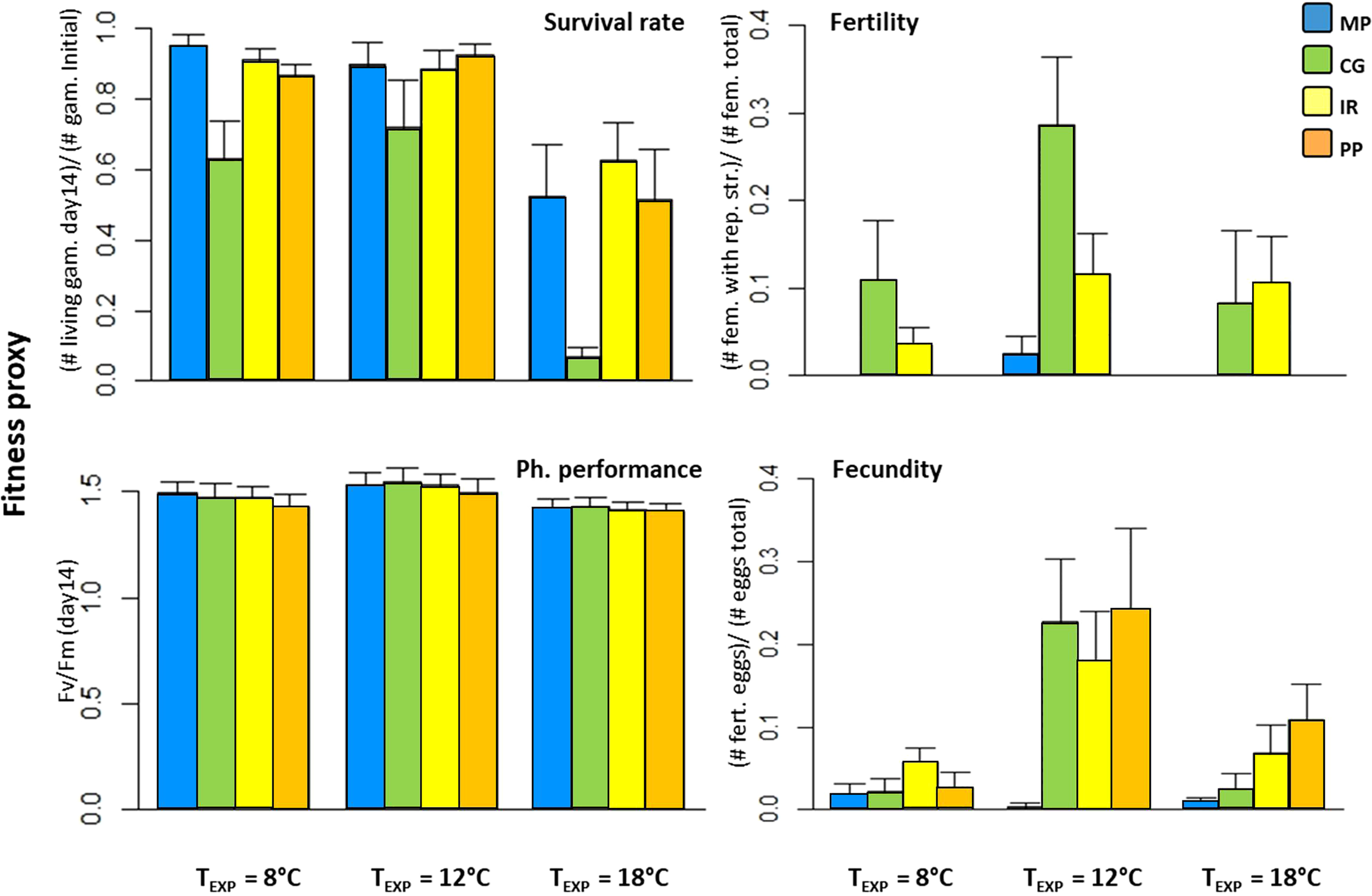 Mean fitness of gametophytes from the four regions included in experiment 1, after 14 days under experimental conditions. Related results of ANOVA and Tukey’s HSD tests were consigned in Table 1 and Table S4, respectively. For the definitions of PP, IR, CG and MP, see Figure 1. The survival rate was quantified as the ratio of the number of living gametophytes at the day 14 to the initial number of gametophytes. Fertility was estimated as the ratio of living females bearing reproductive structures at day 6 to the total number of females. Fecundity was defined as the ratio of egg cells successfully fertilized at day 14 to the total number of eggs. Proxies of physiological vigor were estimated through the parameter Fv/Fm at day 14. Note: no interaction TEXP x Region was significant.