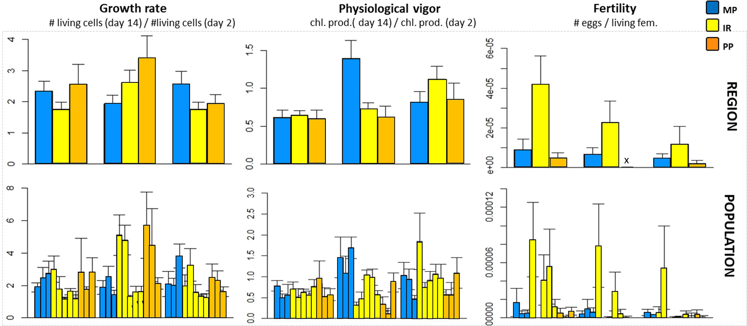Mean fitness of gametophytes included in experiment 2 after 14 days under experimental conditions. Above, the mean fitness was estimated for each region (regional scale, Table 2 and Table S6 for ANOVA and Tukey’s HSD tests). Below, the same experimental outputs were presented at the population-scale. For the definitions of PP, IR, CG and MP, see Figure 1. Populations’ order from left to right on the x-axis corresponds to south-to-north in Figure 1. Growth rate was estimated as the ratio of living cells at day 14 over the day 2. The physiological vigor was estimated as the ratio of chlorophyll a production between day 14 and day 2. Fertility was estimated by counting the number of eggs per living female. The interaction TEXP x Region was only significant for the physiological vigor.