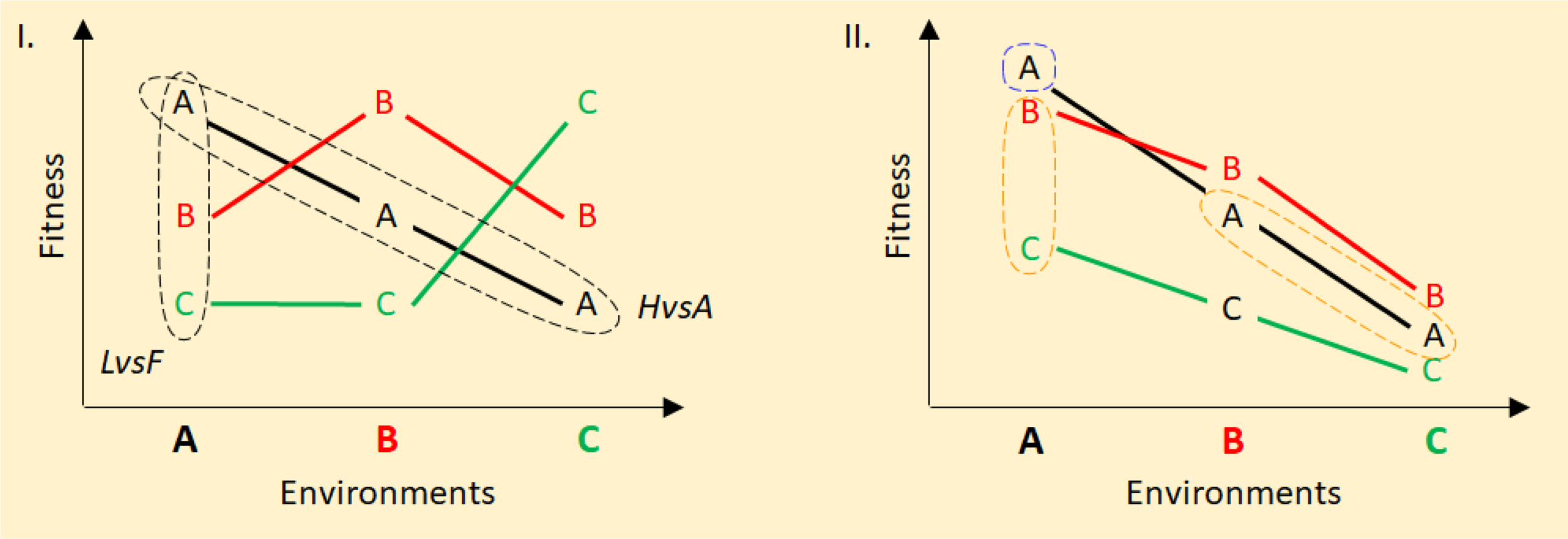 Local adaptation is an evolutionary process resulting from the balance between selection and other forces, leading to an increased average fitness of individuals in the habitat from which they originate. A spatially heterogeneous environment will therefore promote the differentiation of populations occupying different habitats, by evolving different adaptations to each local condition. Testing local adaptation commonly involves reciprocal transplant experiments, yet the statistical treatment can address different predictions from this process. The Local versus Foreign test (LvsF; Leimu and Fisher, 2008) assumes individuals born in environment A will perform better than individuals immigrating from environment B, because the latter are expected to bear adaptations to environment B that are not suitable in environment A. Figure I. below illustrates the case with 3 environments, where individuals in their local environment always perform better than other individuals in that same environment (i.e. comparisons are made “vertically”, that is among individuals from different origins for each specific environmental condition). The Home versus Away test (HvsA; Kawecki and Ebert, 2004) assumes individuals will perform better in their native environment than in any other environment, because the traits that evolved in response to selection from environment A are not suitable in other environments. In figure I., comparisons of average performance of individuals issued from the same population or region are made “horizontally”, i.e. among habitats.