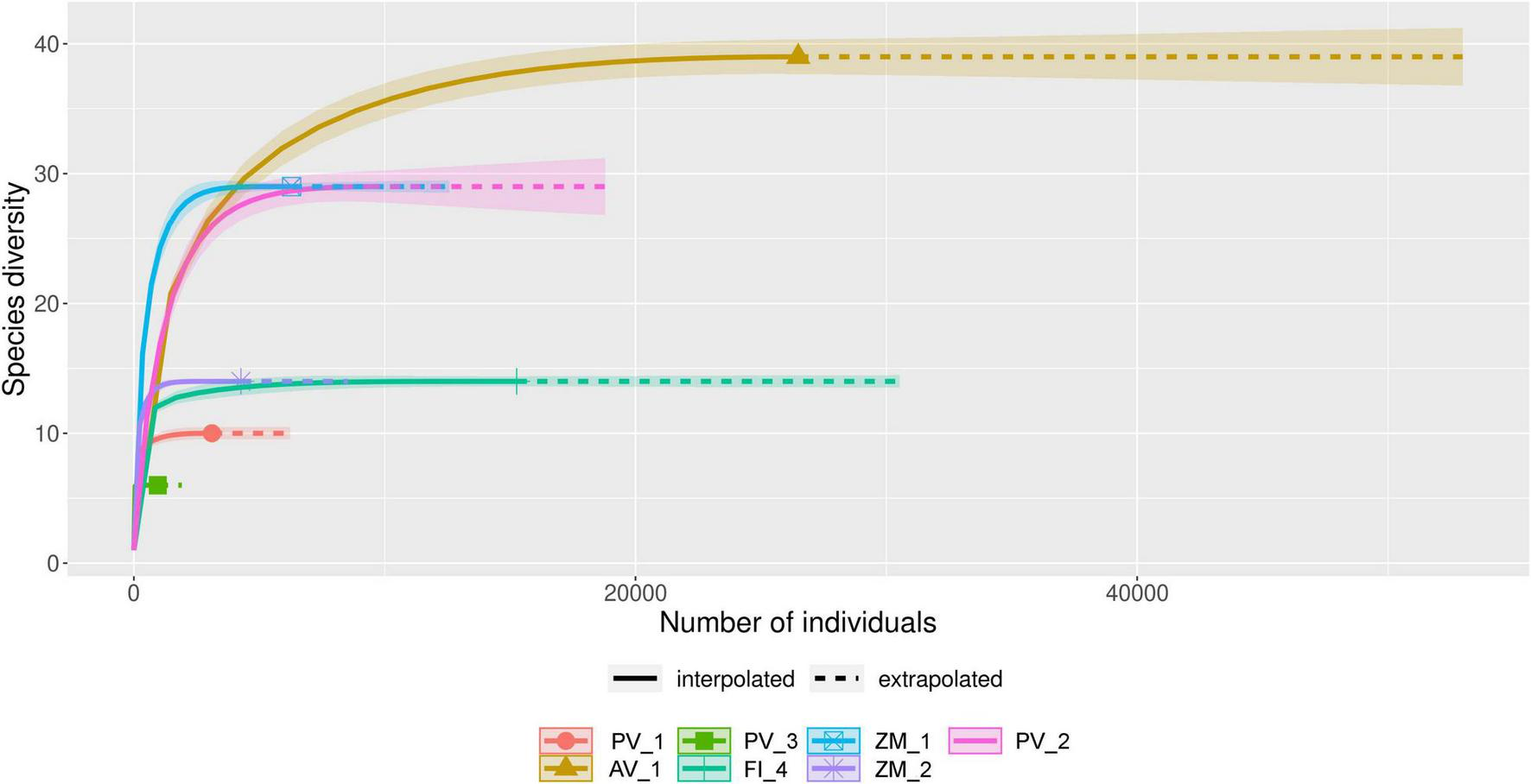 Rarefaction and extrapolation curves of fungal amplicon sequence variants (ASVs) obtained from deep-sea sediment samples collected in the Pescadero Basin (PV_1, PV_2, PV_3), Pescadero Transform Fault (FI_4), Alarcón Rise (AV_1), and Alfonso Basin (ZM_1, ZM_2).
