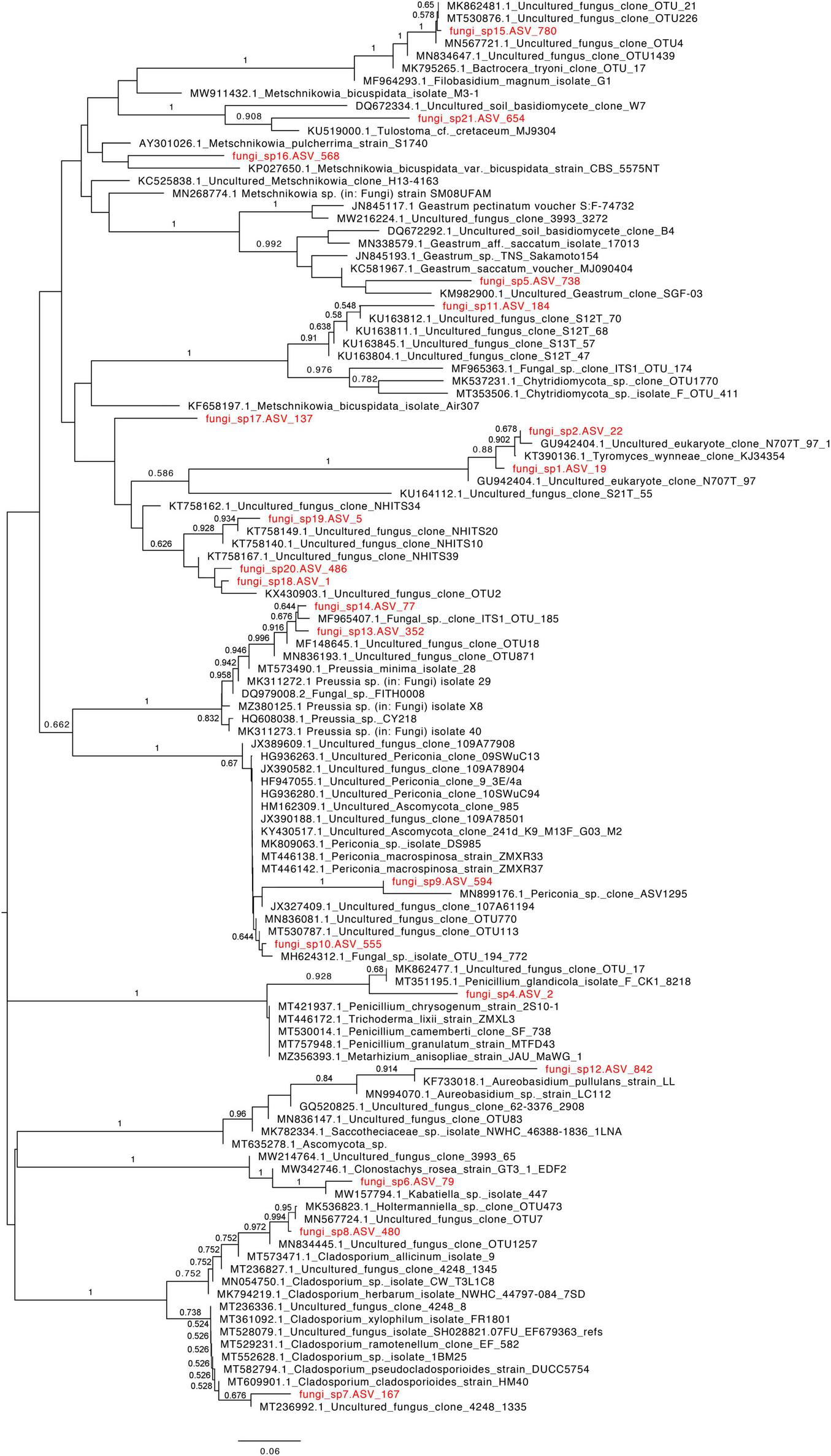Phylogenetic relationship of deep-sea derived ASVs that were taxonomically assigned at the kingdom level (indicated in red font) with close species based on ITS1 rRNA sequences using the neighbor-joining algorithm. Bootstrap values > 50% are indicated above the branches.