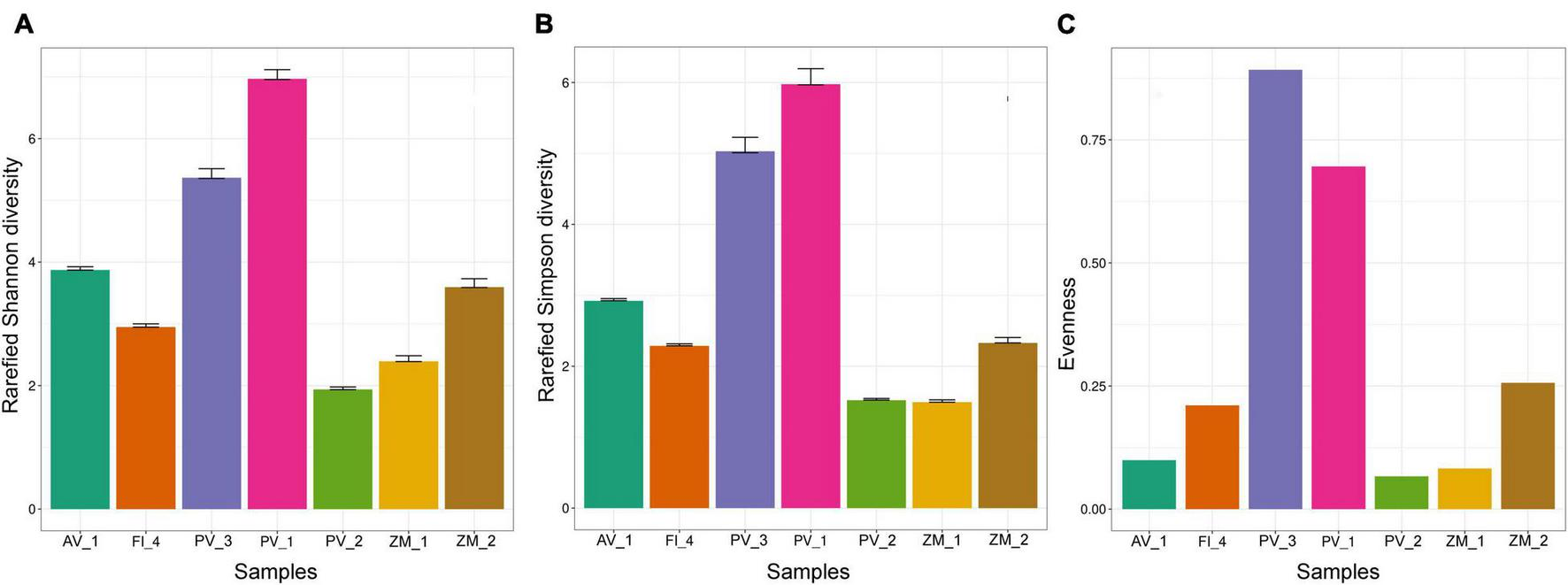 Alpha diversity indexes showed variations in and between ecosystems. For instance, the rarefied Shannon and Simpson metrics agreed that Pescadero Basin showed both, the highest diversity in PV_1 and the lowest diversity in PV_2 (Figures 6A,B and Supplementary Table 1). In addition, the highest evenness was observed in the Pescadero Transform Fault in PV_3 and Pescadero Basin in PV_1, whereas the lowest values corresponded to the Pescadero Basin in PV_2, Alfonso Basin in ZM_1, and the Alarcón Rise in AV_1 (Figure 6C).