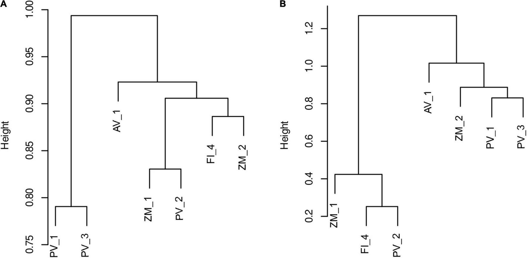 Dendrogram generated using Ward’s clustering criterion showing dissimilarities of fungal communities in sediment samples from deep-sea low- and high-temperature hydrothermal vents, and an oxygen minimum zone based on Sorensen (A) and Bray-Curtis (B) metrics. Height indicates distance given the dissimilarity metrics.