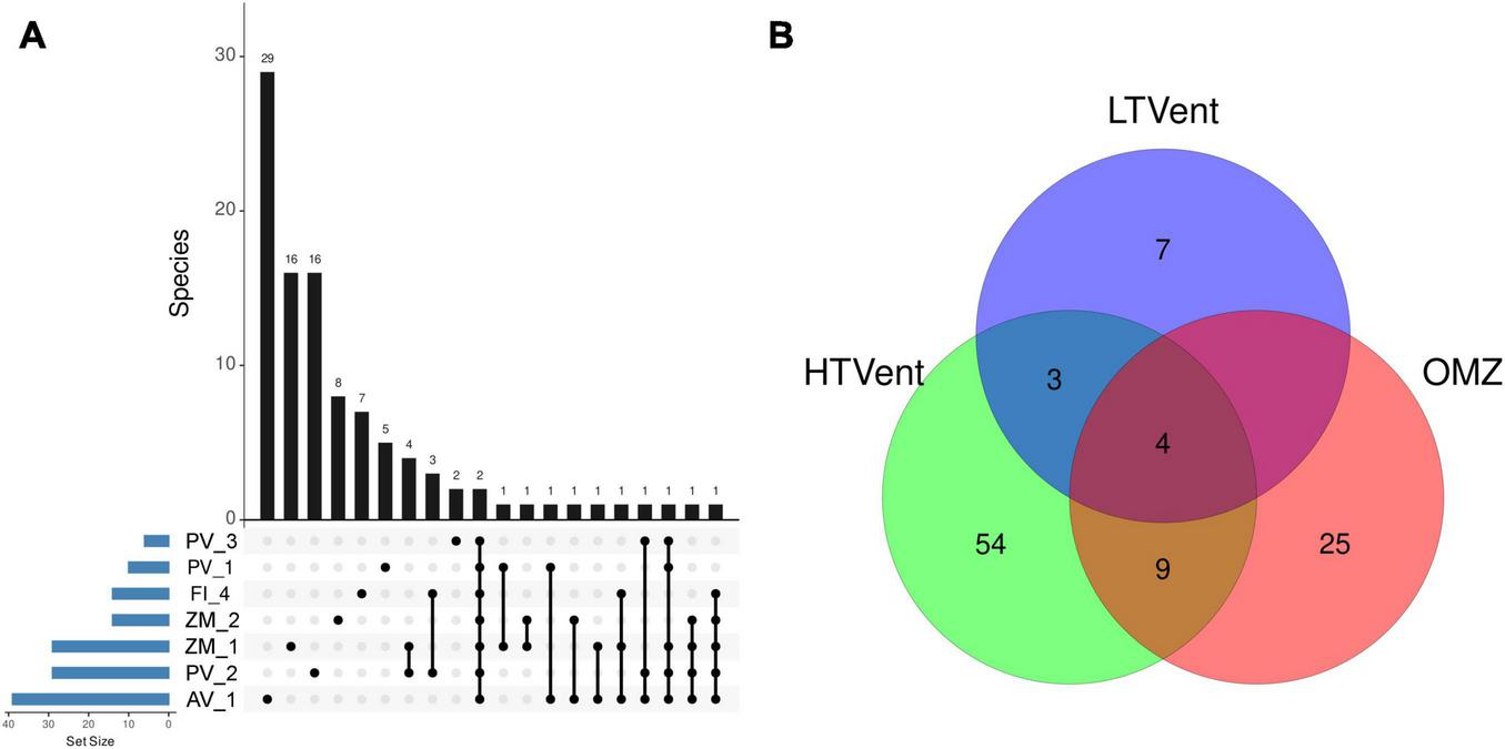Upset plot indicating overlapping and unique fungal AVSs across the seven sampling sites stacked in the x-axis (A), where the set size represents the overall number of species for each sample; and Venn diagram (B) showing the total number of shared and uniquely retrieved fungal AVSs in deep-sea low-temperature hydrothermal vents, high-temperature hydrothermal vents, and an oxygen minimum zone. HTVent, high-temperature vents; LTVent, low-temperature vent; OMZ, oxygen minimum zone.