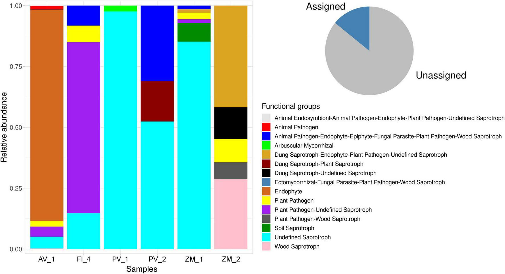 FUNGuild analysis was performed to predict functions of fungal communities, accounting for the determination of 16.57% of total reads (pie chart Figure 10). No hits were obtained for the site PV_3 in the Pescadero Transform Fault. The analysis revealed characteristic functional guilds in each ecosystem, with the dominance of undefined saprotrophs in the Pescadero Basin, endophytes in the Alarcón Rise, and dung-saprotroph-endophyte-plant pathogen-undefined saprotrophs in Alfonso Basin. The site AV_1 in the Alarcón Rise showed the richest functional diversity (including animal endosymbiont-animal pathogen-endophyte-plant pathogen-undefined saprotrophs, animal pathogens, dung saprotroph-plant saprotrophs, ectomycorrhizal-fungal parasite-plant pathogen-wood saprotrophs, endophytes, plant pathogens, plant pathogen-undefined saprotrophs, plant pathogen-wood saprotrophs, undefined saprotrophs, and wood saprotrophs), whereas PV_1 in the Pescadero Basin the lowest (Figure 10).