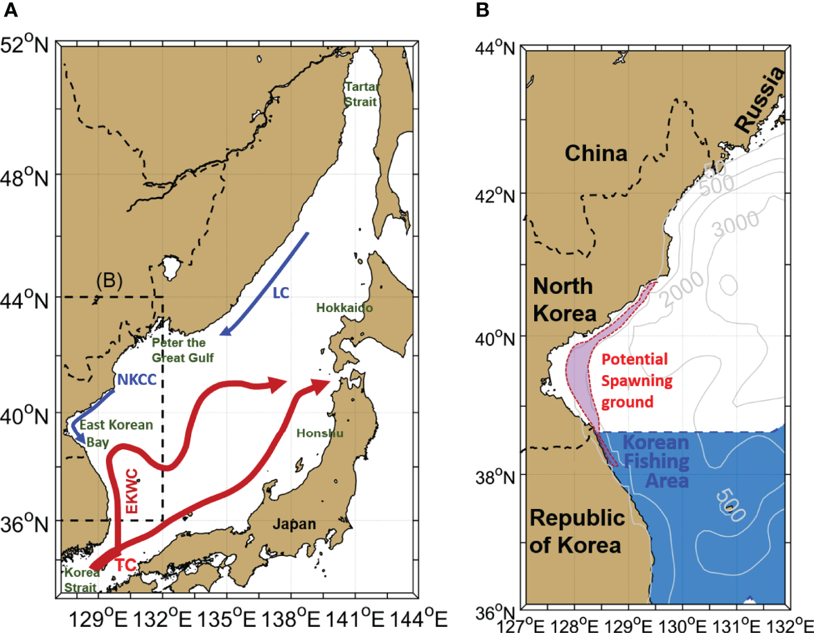 Figure 1 (A) Major currents in the East/Japan Sea (EJS). The TC, EKWC, NKCC and LC represent the Tsushima Current, East Korean Warm Current, North Korean Cold Current and Liman Current, respectively. (B) Study area indicating the spawning ground (red shading) of walleye pollock in the East Korean Bay (EKB) and Korean fishing area (blue shading).