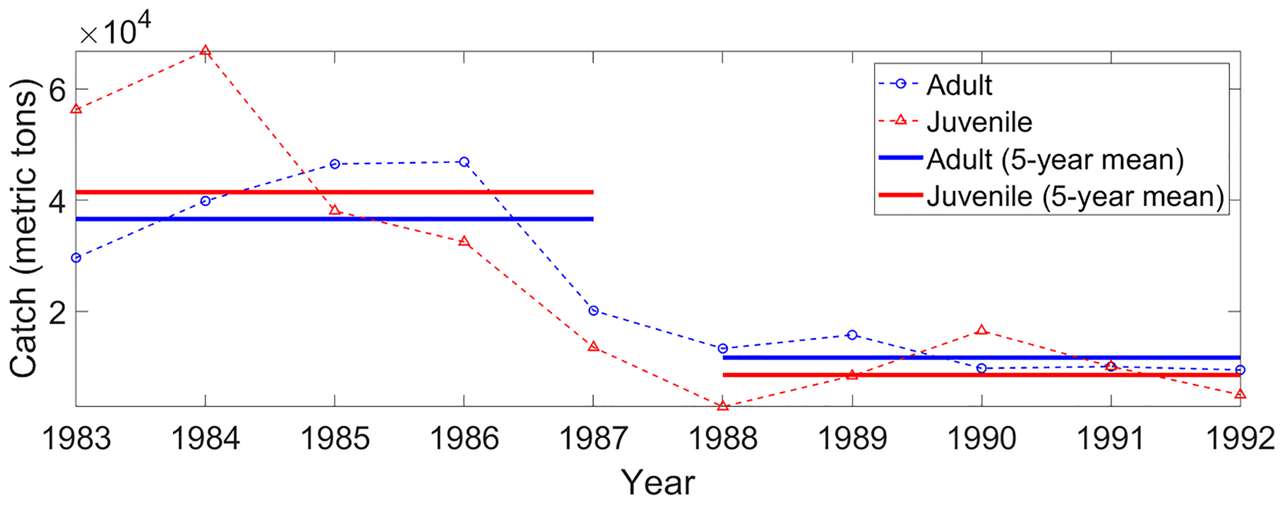 Figure 2 Annual mean catches of walleye pollock in the Korean fishing area during 1983–1992. Red triangles and blue circles denote juvenile and adult walleye pollocks, respectively. Red and blue solid lines indicate the 5-year mean catches of juvenile and adult walleye pollocks, respectively. Catch data for walleye pollock was obtained from KOSIS (Korean Statistical Information Service; https://kosis.kr/statHtml/statHtml.do?orgId=101&tblId=DT_1EW0004&conn_path=I2).