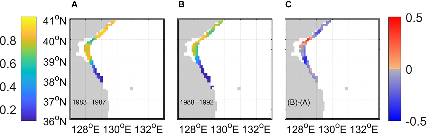 Figure 3 Suitable Spawning Period Ratio at each grid in the EKB. It was calculated as suitable days for spawning divided by total days from January to February during (A) 83–87 and (B) 88–92. (C) Difference between the two periods.