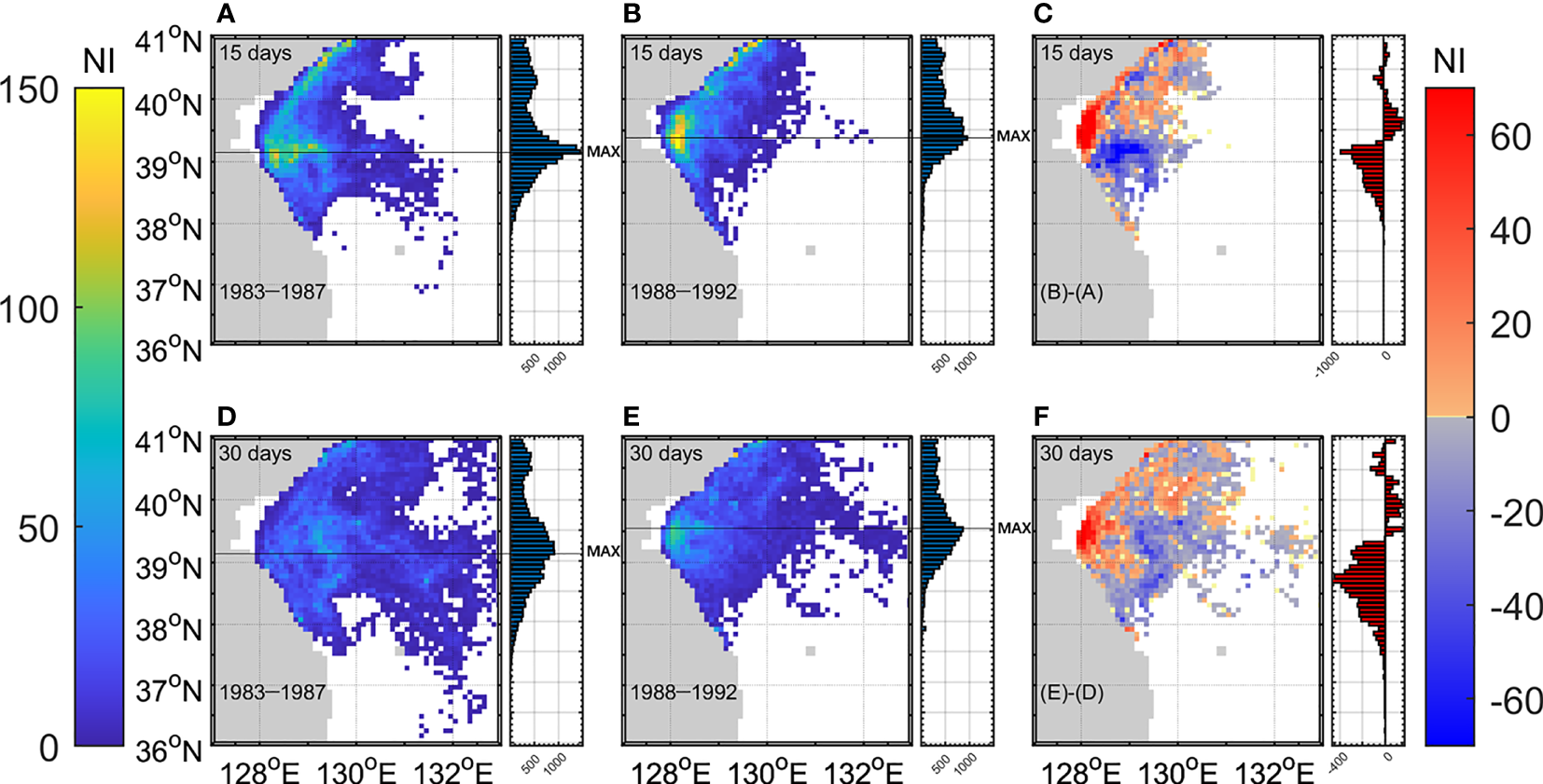 Figure 4 Horizontal distribution of individual abundance at each grid 15 days after spawning for (A) 83–87 and (B) 88–92. (C) Difference between the two periods. (D-F) are the same except at 30 days after spawning. Meridional distributions of individual abundances are denoted next to the horizontal maps.