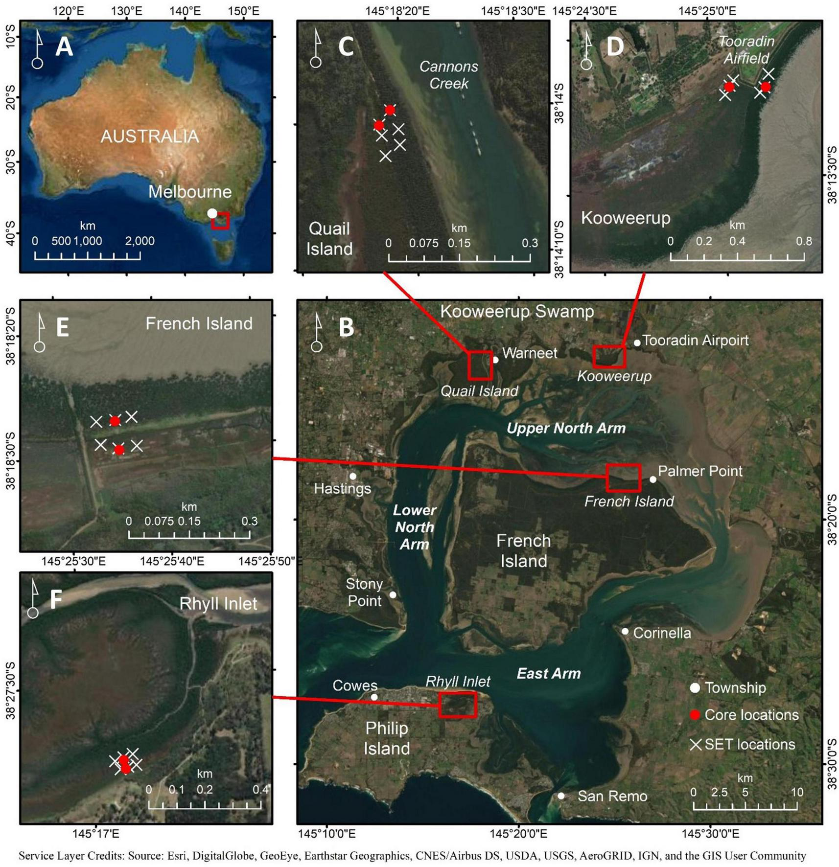 (A) Location of Westernport Bay, Australia, and the (B) focal study sites where cores were extracted from the mangrove and saltmarsh at (C) Quail Island, (D) Kooweerup, (E) French Island, and (F) Rhyll.