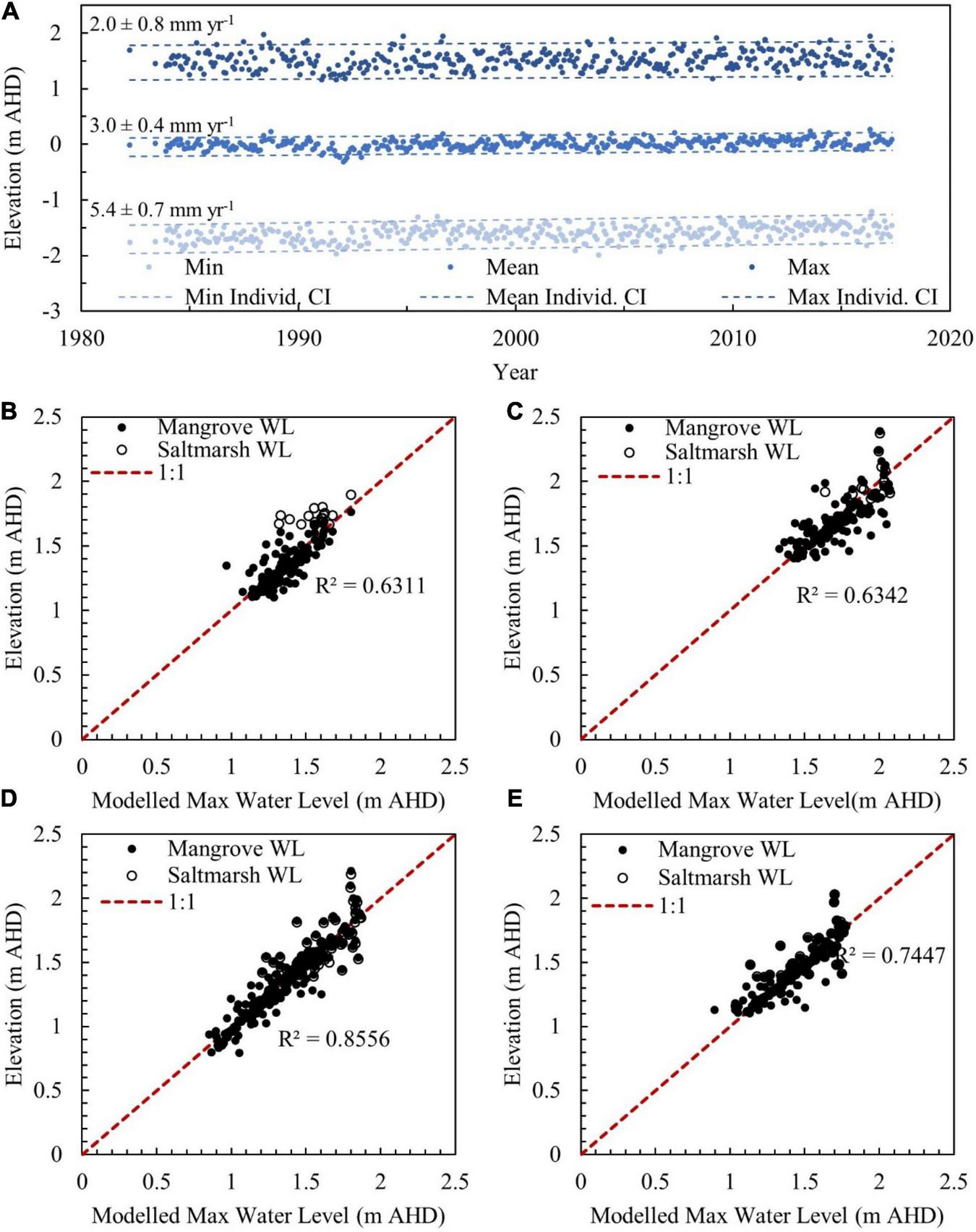 (A) Minimum, mean, and maximum monthly water levels at the Stony Point tide gauge, with 5% and 95% confidence interval for each variable defined by the dashed lines. Relationship between observed daily maximum water levels in the mangrove and saltmarsh zones and modeled maximum water levels at (B) French Island, (C) Kooweerup, (D) Quail Island, and (E) Rhyll.