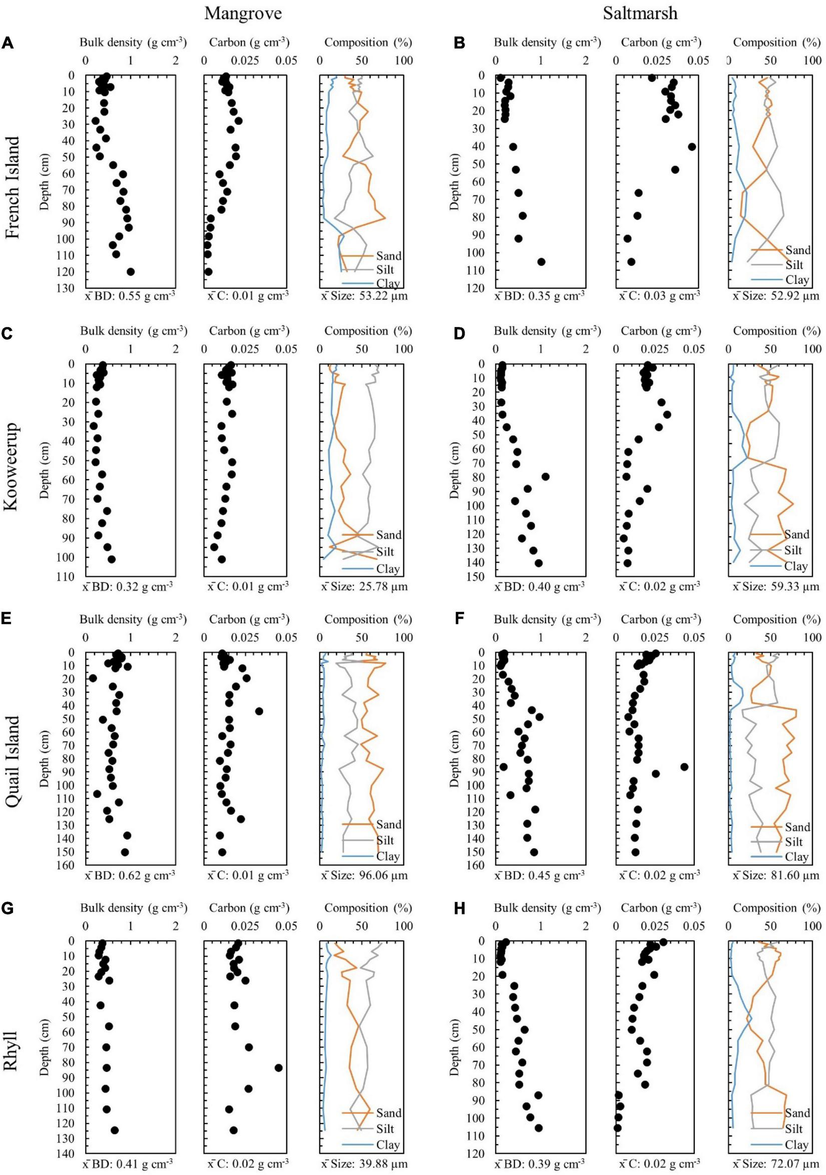 Bulk density, carbon content, and grain size fraction down cores extracted from the mangrove and saltmarsh zones at (A,B) French Island, (C,D) Kooweerup, (E,F) Quail Island, and (G,H) Rhyll.