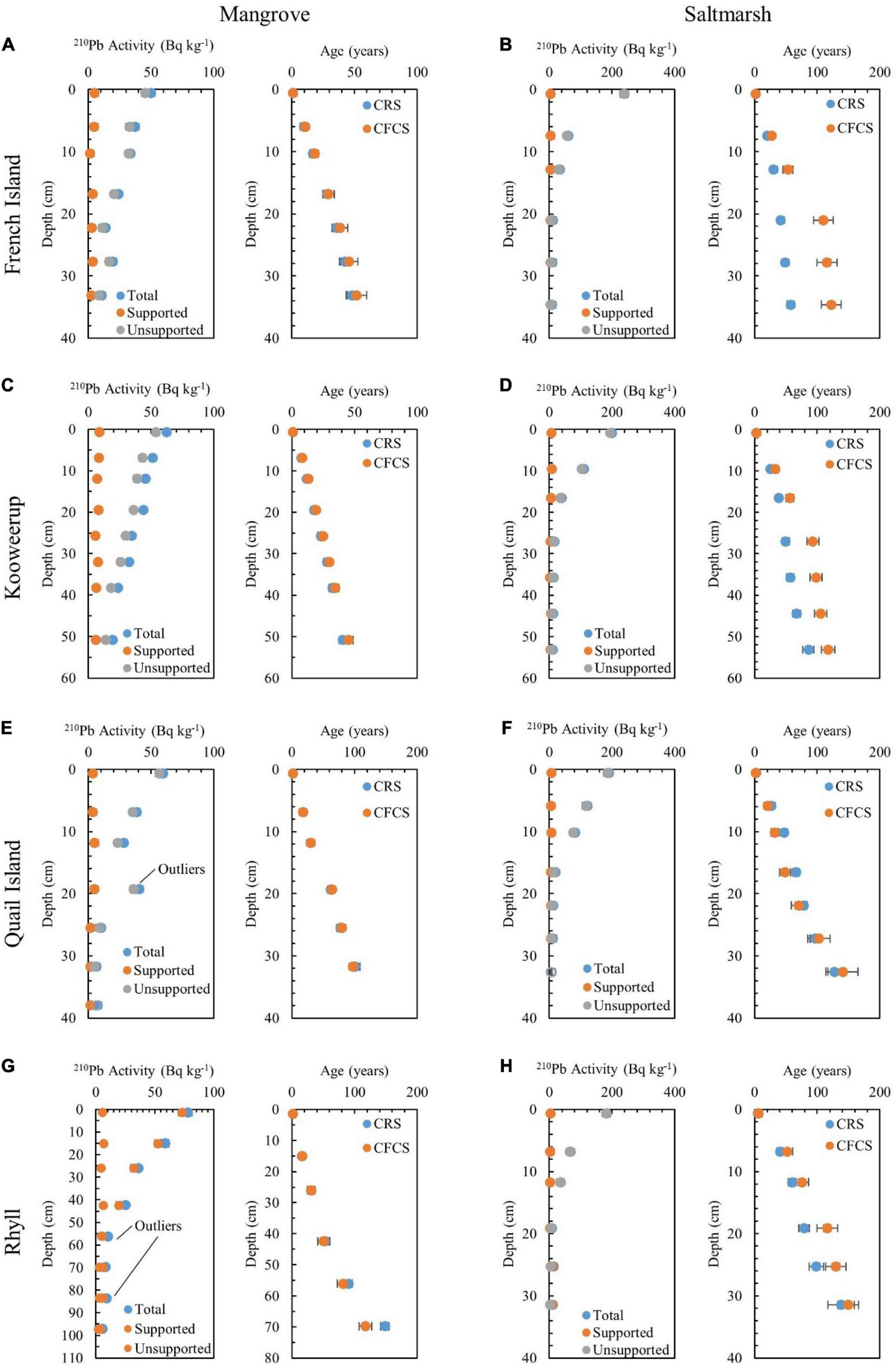 Lead-210 activity and modeled sediment ages using the CRS and CFCS models confirmed decay of unsupported 210Pb activities against depth, as indicated in Figure 4. Outliers were excluded from age calculations and the three identified outliers were limited to mangrove sediments at Quail Island and Rhyll.