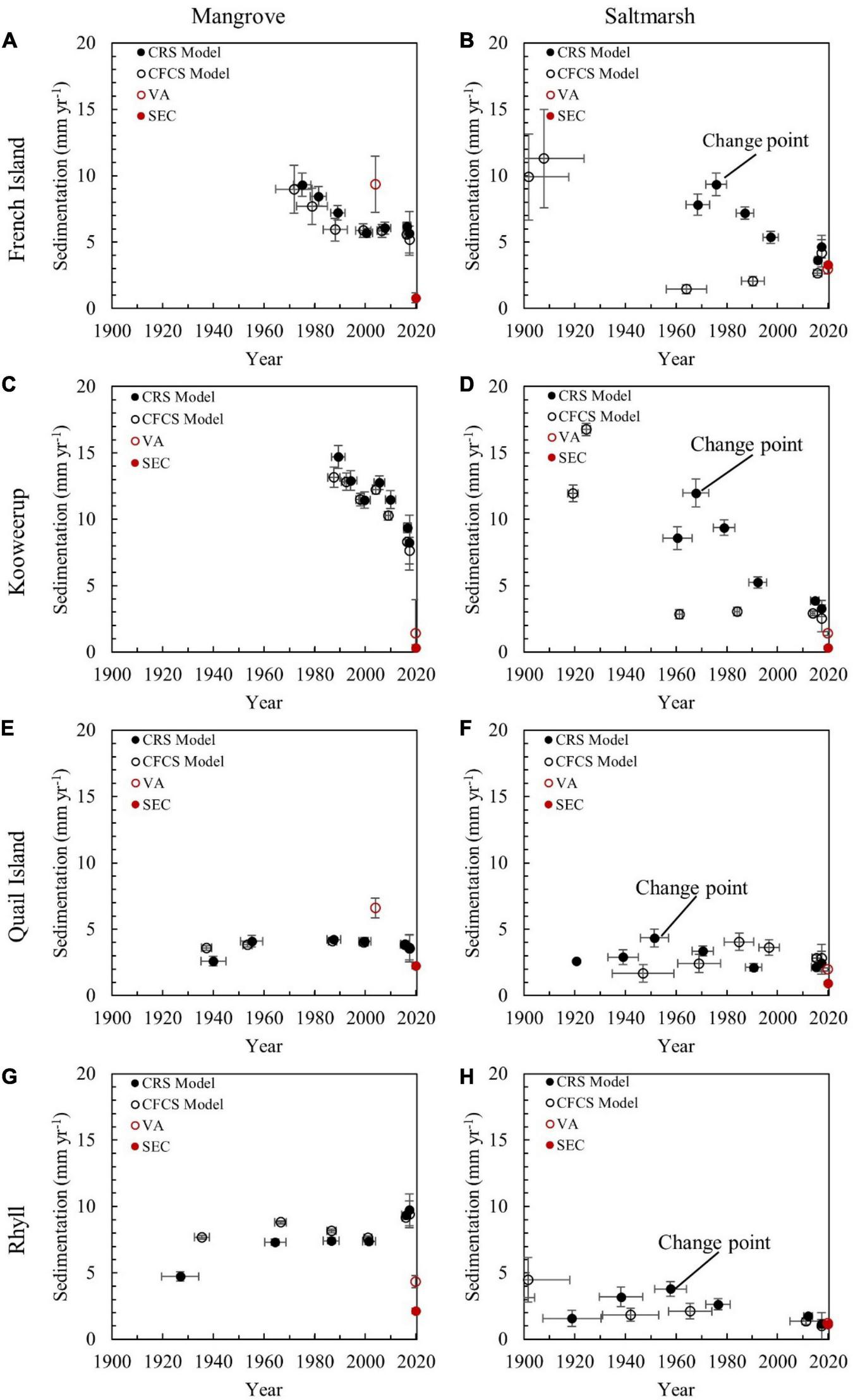 Reconstructed sedimentation rates over time from the mangrove and saltmarsh zones at (A,B) French Island, (C,D) Kooweerup, (E,F) Quail Island, and (G,H) Rhyll. Sedimentation rates were validated against vertical accretion (VA) and surface elevation change (SEC) determined at the adjacent SET-MH monitoring station.