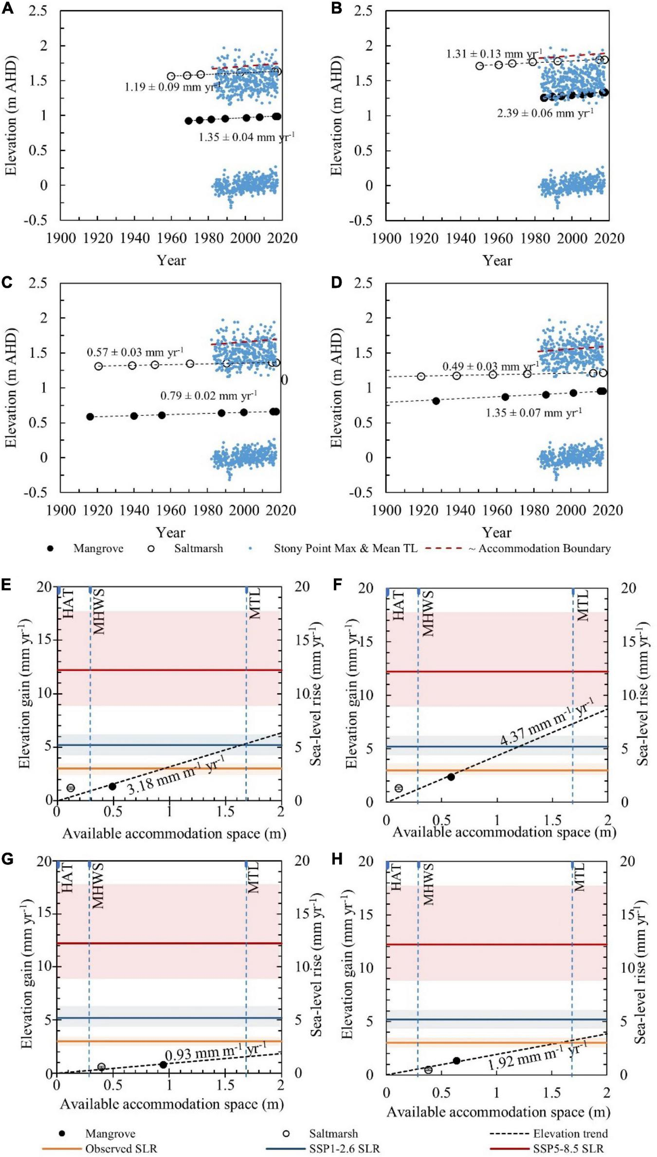 Stony Point water levels, modeled upper boundary of accommodation space (based on amplification factor in Supplementary Figure 2) and reconstructed surface elevations (based on autocompaction relationship in Supplementary Figure 1) within the mangrove and saltmarsh zones at (A) French Island, (B) Kooweerup, (C) Quail Island, and (D) Rhyll; and relationship between surface elevation gain and available accommodation space at (E) French Island, (F) Kooweerup, (G) Quail Island, and (H) Rhyll. Observed rates and projected rates of SLR have been included for comparison of accommodation space dependent sedimentation rates in panels (E–H).