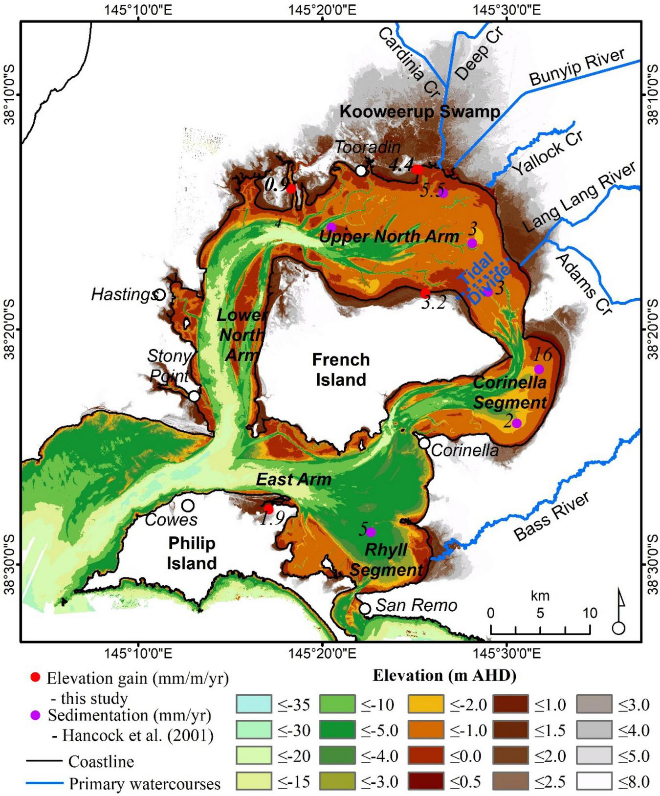 Water-level data from tide gauges can also be used to indicate the vertical position within the tidal frame that mangroves and saltmarshes occupy, and the space available for tidally-borne sedimentation, known as accommodation space. However, they may not be a precise indicator of tidal behavior at locations distal to tide gauges as tides can become amplified or attenuated as they propagate along estuaries and embayments (Kumbier et al., 2021). Tidal analyses have confirmed that tides do amplify along the northern arm of Westernport Bay (Water Technology, 2014a), due to the one quarter wavelength resonance of the lunar semidiurnal tide within Westernport Bay. Accordingly, the upper boundary of accommodation space at study sites along the Northern Arm, namely at French Island, Kooweerup and Quail Island, will likely be higher than indicated by tide gauge data alone.