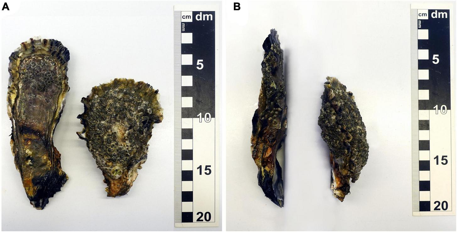 Figure 1. Detailed view of two Magallana gigas individuals illustrating the variability of the oyster shell morphology of mature individuals. (A) View along the long axis of the oyster shells. (B) View along the short axis of the oyster shells.