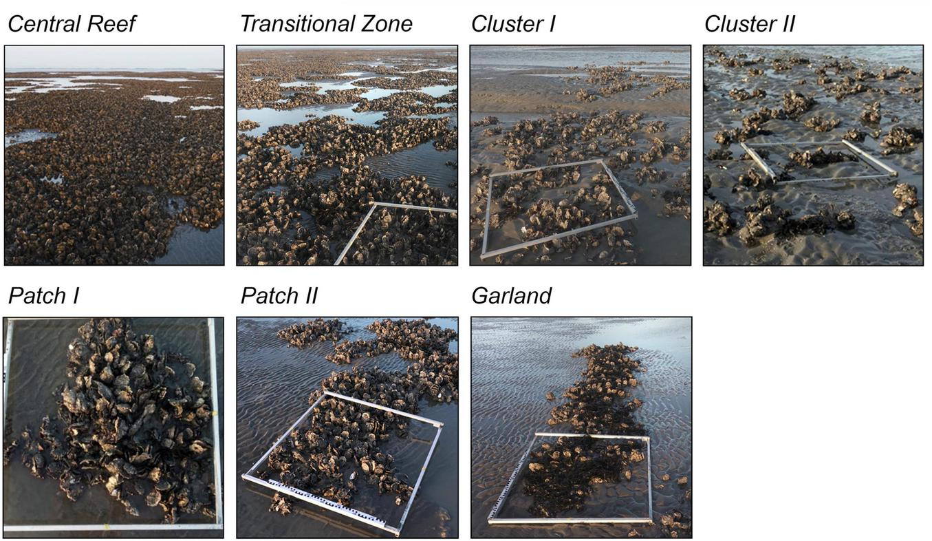 This work proposes a structural classification within and in the surrounding of oyster reefs; the remainder of this work will test its applicability. Based on initial visual on-site observations, seven structural classes are proposed: Central Reef, Transitional Zone, Cluster I, Cluster II, Patch I, Patch II, and Garland. These classes are characterized by varying properties such as shape, oyster coverage and orientation as well as sediment gaps between individual oysters and sediment coverage (Figure 3 and Table 1). Moreover, the structural classes can be subdivided into surfaces with homogenous oyster coverage (Central Reef, Transitional Zone), surfaces with dense agglomerations of oysters (Cluster I and Cluster II) as well as isolated and enclosed shapes (Patch I, Patch II, and Garland).