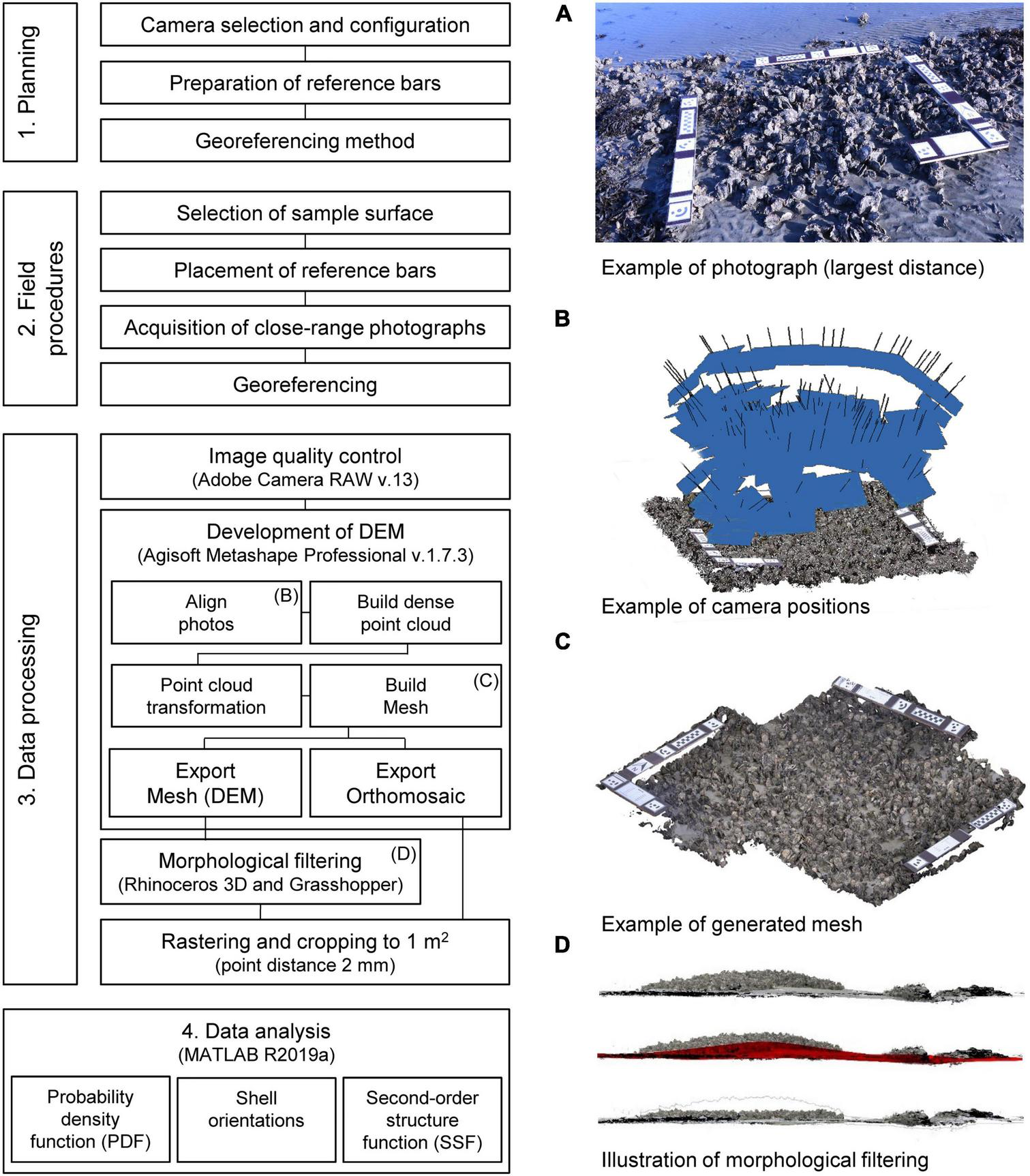 Figure 4. A schematic diagram of the workflow for the development of digital elevation models (DEMs) and subsequent analysis. (A) Example of a photograph used for the SfM photogrammetry (largest distance). (B) Illustration of the camera positions in Agisoft Metashape. The blue patch and black lines illustrate the position of the camera and their orientations. (C) Example of a generated mesh including the reference bars before cropping. (D) Illustration of the morphological filtering. The NURBS surface is illustrated in red.