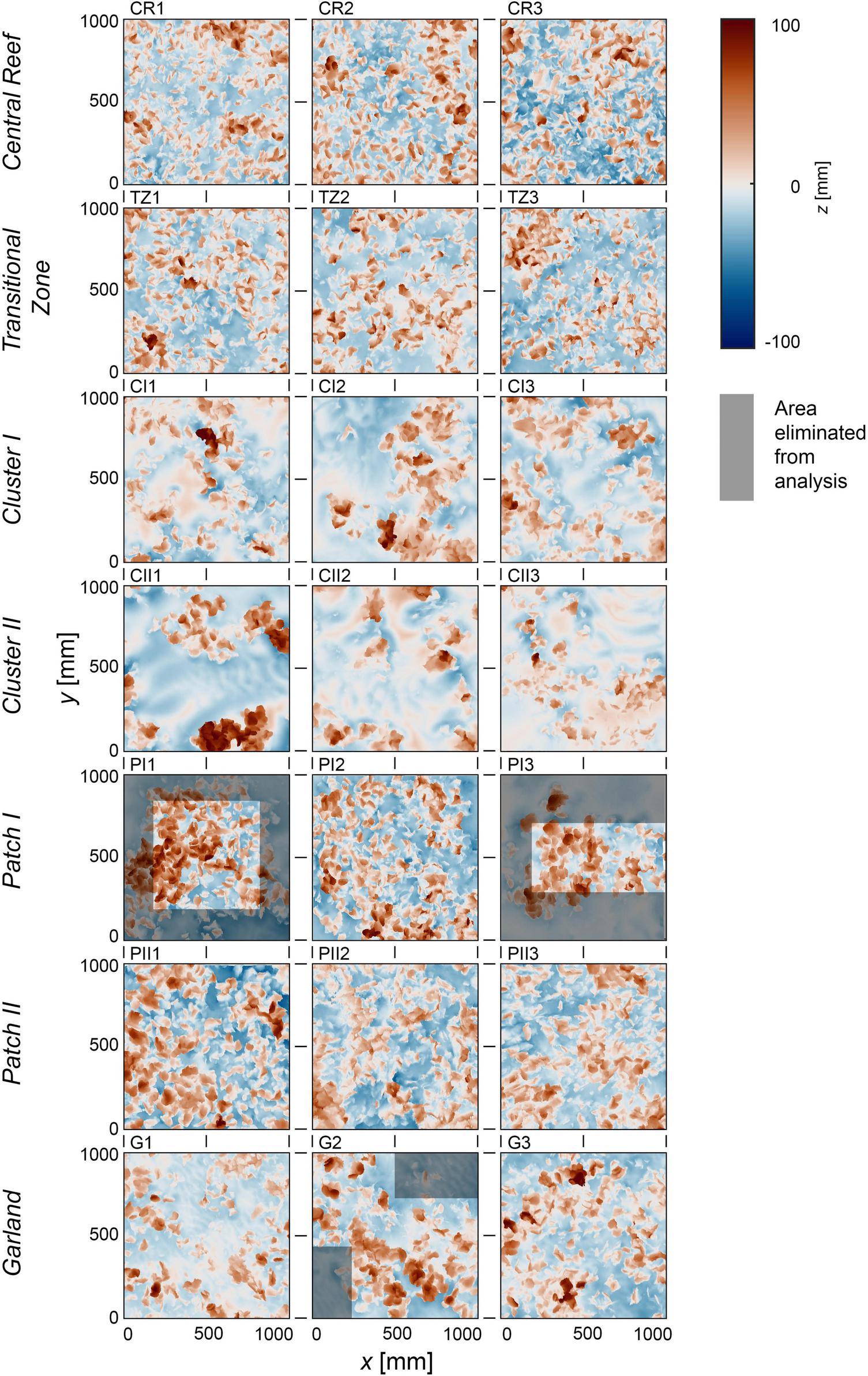 Figure 5 shows the DEMs of the 21 samples using their mean elevation as reference height z = 0 mm. The visualizations of the Central Reef, Transitional Zone, and Patch II samples show homogeneous distributions of surface level elevations for the entire section. For the Cluster I and Cluster II samples, concentrated agglomerations of the surface level elevations can be observed as expected (cf. Table 1). While the samples PI2, G1, and G3 show homogeneous distributions of the surface level elevations, the samples PI1, PI3, and G2 show inhomogeneities. In these cases, the surface area of the isolated patches is smaller than 1 m2. For the statistical analysis, a section of the surface with a homogeneous distribution of the surface level elevations is necessary. The analyzed surfaces are, hence, reduced until the edges of the patches and the surrounding bare sediment are eliminated and a homogenous surface remains (the eliminated area is illustrated in gray boxes in Figure 5).