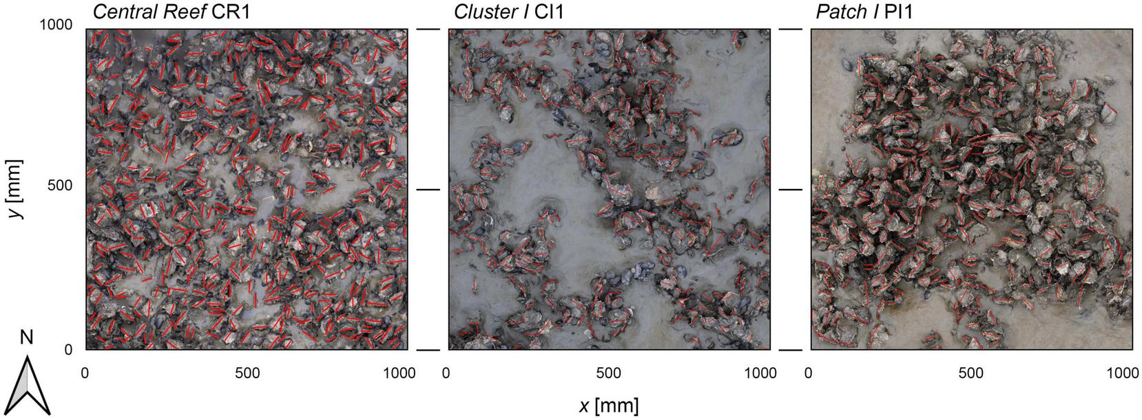 Figure 6. Three examples of the orthomosaics used to derive the abundance and the dorso-ventral orientation. The x- and y-axis are in mm. Red lines mark the short axis of the identified individual oyster shells. The panels show the samples of Central Reef CR1, Cluster I CI1, and Patch I PI1. Each photo covers 1 m2 with the upper side facing north.