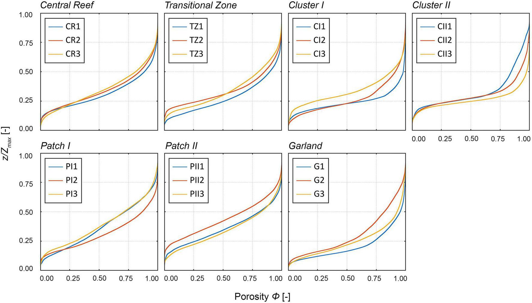 The normalized vertical distributions of the porosity further illustrate differences between structural classes (Figure 8). For the structural classes with homogenous oyster coverage (Figure 8, top row), an increase in the gradient can be observed from Central Reef over Transitional Zone, Cluster I to Cluster II. The increasing gradient is in line with the increase in bulk porosities Φbulk, respectively (Table 2). For the Cluster I and II samples, a plateau around z/Zmax = 0.25 becomes visible for the porosity range Φ = ∼0.25–0.75. The Patch I and II samples exhibit similar moderate courses as Central Reef, while the Garland samples displays a plateau like the Cluster I and II samples around z/Zmax = 0.15 for the porosity range Φ = ∼0.05–0.50. The Central Reef samples nearly collapse on a single line, while all other samples exhibit deviations within the respective structural class. Largest deviations can be found for the Garland and Cluster II samples. It is striking that deviations within the Patch I and Garland samples are mostly noticeable at Φ > 0.5. At low porosity values, the samples show similar relationships between porosity and z/Zmax.