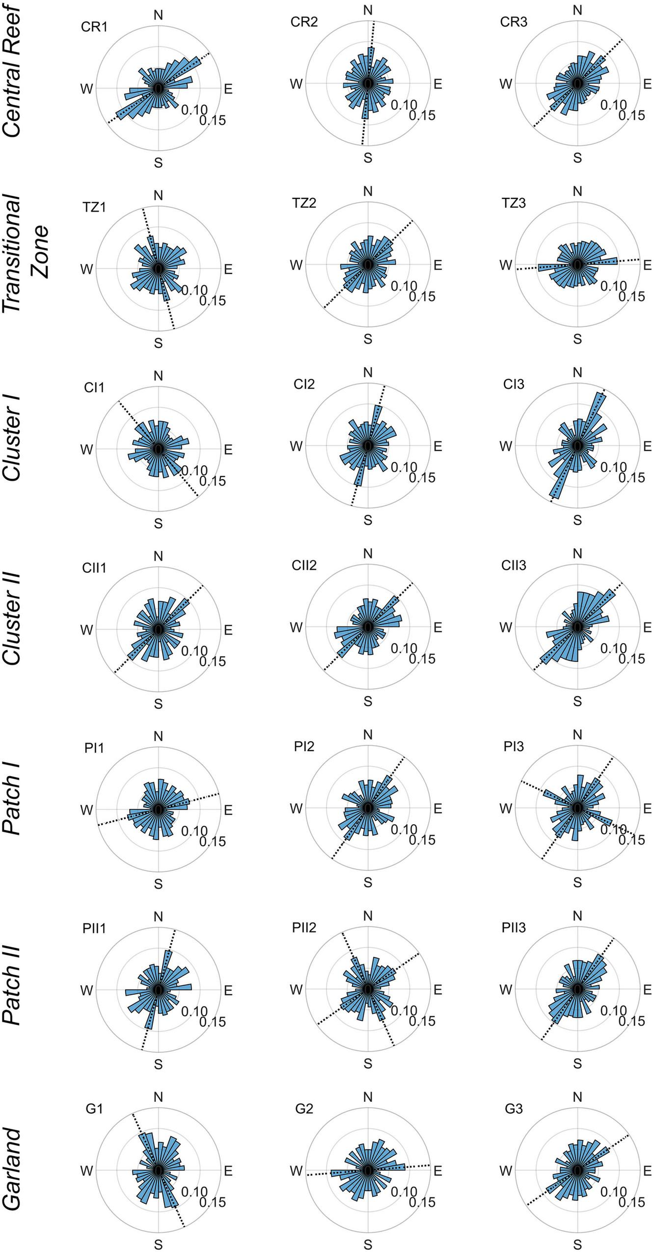 The analysis of the dorso-ventral orientations of the individual oyster shells (Figure 9) reveals anisotropic behavior. Although all rose diagrams in Figure 9 are characterized by scatter, a major direction ϕShells can be determined. The latter is defined as the orientation of the bin (or two adjacent bins) with the highest frequency of oyster shell orientations (dashed lines in Figure 9 and Table 2). In two cases PI3 and PII2, two major orientations can be identified. The extent to which the bin of the major orientation is pronounced varies between samples. However, little differences can be identified between the structural classes. Still, a clear anisotropic characteristic of the dorso-ventral orientations across all structural classes can be confirmed. The major orientations of Central Reef, Transitional Zone as well as Cluster I and Cluster II samples are oriented from northeast to southwest with varying degrees, with exception of TZ1. For samples of Garland, Patch I, and Patch II, no common geographical orientation can be assigned.