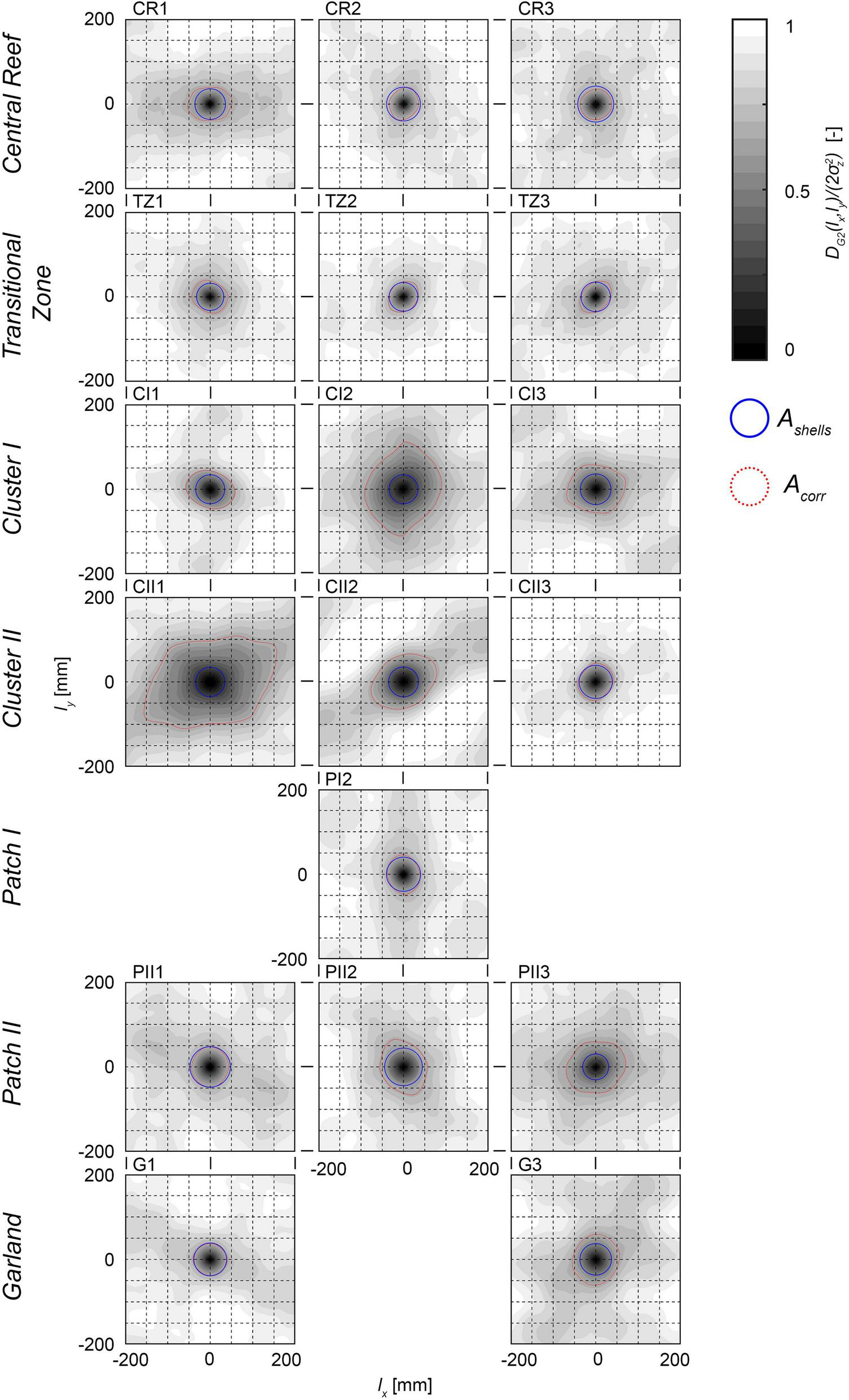 Figure 10. Visualizations of the 2D second-order structure functions (2D-SSFs) for each sample surface normalized by the respective variances DG2(lx,ly)/2σz2. The x- and y-axis show the spatial lags lx and ly [mm]. The gray scale reflects the normalized 2D-SSF values [-], where dark areas indicate high levels of correlation approaching DG2(lx,ly)/2σz2 = 0. Blue circles represent the area Ashells whose radii are equal to the mean width wmean of the oyster shells; Red dashed lines illustrate the area of significant correlations Acorr which is DG2(lx,ly)/2σz2 ≤ 0.7. The sub-figures are sorted by proposed structural classes. PI1, PI3, and G2 are not evaluated.