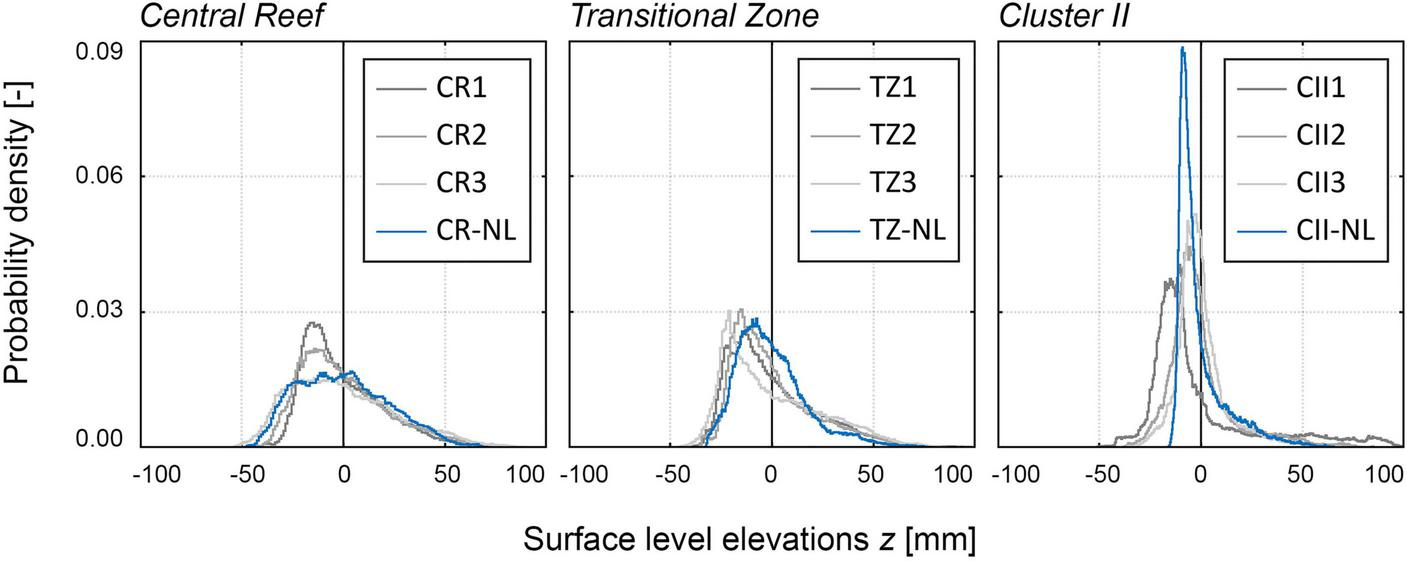 Figure 11. Histograms based on surface level elevation z [mm] illustrating the PDFs [-] of the samples of Central Reef, Transitional Zone, and Cluster II including the validation samples recorded at the oyster Nordland. The PDFs are centered around the zero mean. The gray colors indicate the individual samples of Kaiserbalje as presented in Figure 5 and the blue color indicates the sample of Nordland, e.g., dark gray: CR1, medium gray: CR2, light gray: CR3, blue: CR-NL, etc.