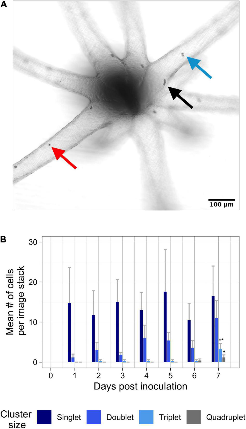 Colonization by B. minutum over 1 week at 26°C. (A) Colonizing symbionts were tracked within the tentacles of tiny Aiptasia polyps with the genetic host strain background of H2 (n = 7 anemones). For each day, one brightfield confocal z-stack per anemone was used to capture all information between the focal planes of the closest and furthest tissue. Clusters of symbiont cells were identified over a period of 7 days. (B) The cluster sizes of singlets (red arrow), doublets (blue arrow), triplets (not shown) and quadruplets (black arrow) were summarized within tentacles to find mean abundances of cells per cluster size over time. Aiptasia were inoculated with a concentration of 1 × 104 cells ∙ mL–1. Error bars signify standard error. Asterisks represent statistically significant differences after ANOVA and Tukey post hoc test: **p < 0.005 for triplets at 7 days compared to all other days; *p < 0.05 for quadruplets at 7 days compared to days 1–5.