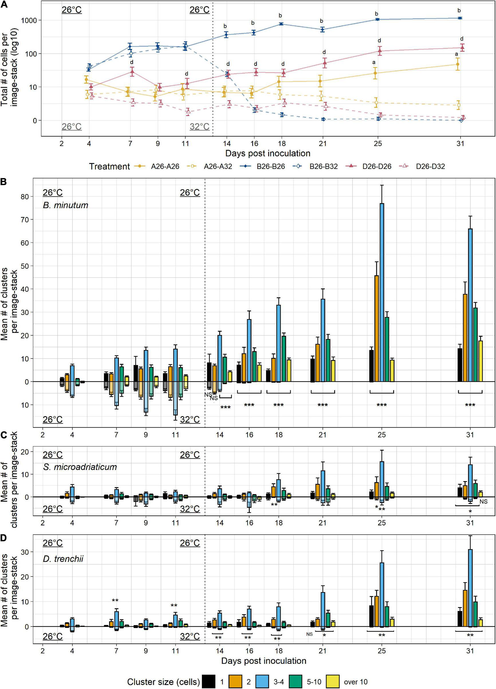 Colonization by B. minutum, S. microadriaticum, and D. trenchii over 4 weeks at 26 and 32°C. (A) Bleached Aiptasia polyps were colonized with one of three species of algal symbionts: B. minutum, S. microadriaticum, and D. trenchii and subjected to a temperature treatment of a constant 26°C or a temperature shift from 26 to 32°C to compare colonization and bleaching phenotypes. The total numbers of cells per sample image-stack were measured over a 4 week period for each symbiont (3 sample image-stacks per anemone host, 12 anemones per treatment). During the first week both treatments received the same 26°C temperature treatment to promote colonization. After 7 days, one temperature treatment remained at 26°C and the other temperature treatment was moved to 32°C. Aiptasia were inoculated with a concentration of 5 × 105 cells ∙ mL–1. Y-axis is log10 transformed for clarity. (B–D) The mean number of cell clusters per image-stack were binned into discrete cell cluster sizes measured over 3 weeks for each symbiont species, (B)B. minutum, (C)S. microadriaticum, and (D)D. trenchii. 26°C treatment for 3 weeks is shown on the positive y-axis, while 26–32°C treatment is shown on the negative y-axis, reflected across the x-axis for comparison. The beginning of the difference in treatment conditions is indicated by a vertical dotted line at 13 days post-inoculation. Error bars signify standard error for the total abundance of clusters or cells. Letters (A) and asterisks (B–D) indicate significant differences between temperature treatments within symbiont species at each timepoint by Tukey post hoc tests (*p < 0.05, **p < 0.01, ***p < 0.001).