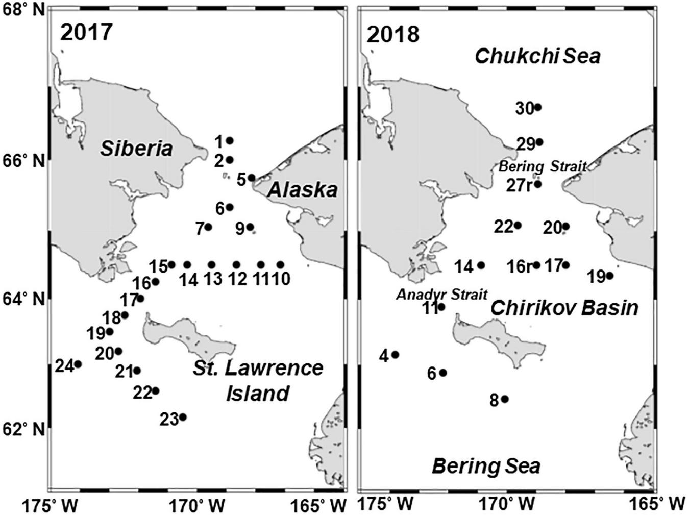 Location of stations in the northern Bering Sea during 11–22 July 2017 and 2–12 July 2018. The numbers indicate the station ID.