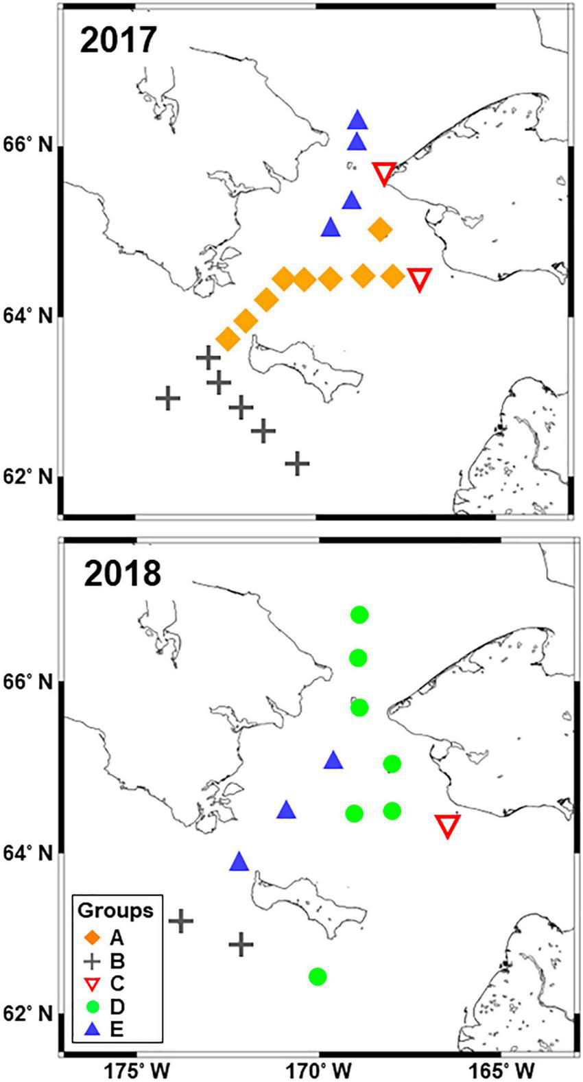 Horizontal distribution of the five groups identified from the Bray–Curtis similarity analysis based on zooplankton abundance (cf. Figure 4) in the northern Bering Sea during July of 2017 and 2018.