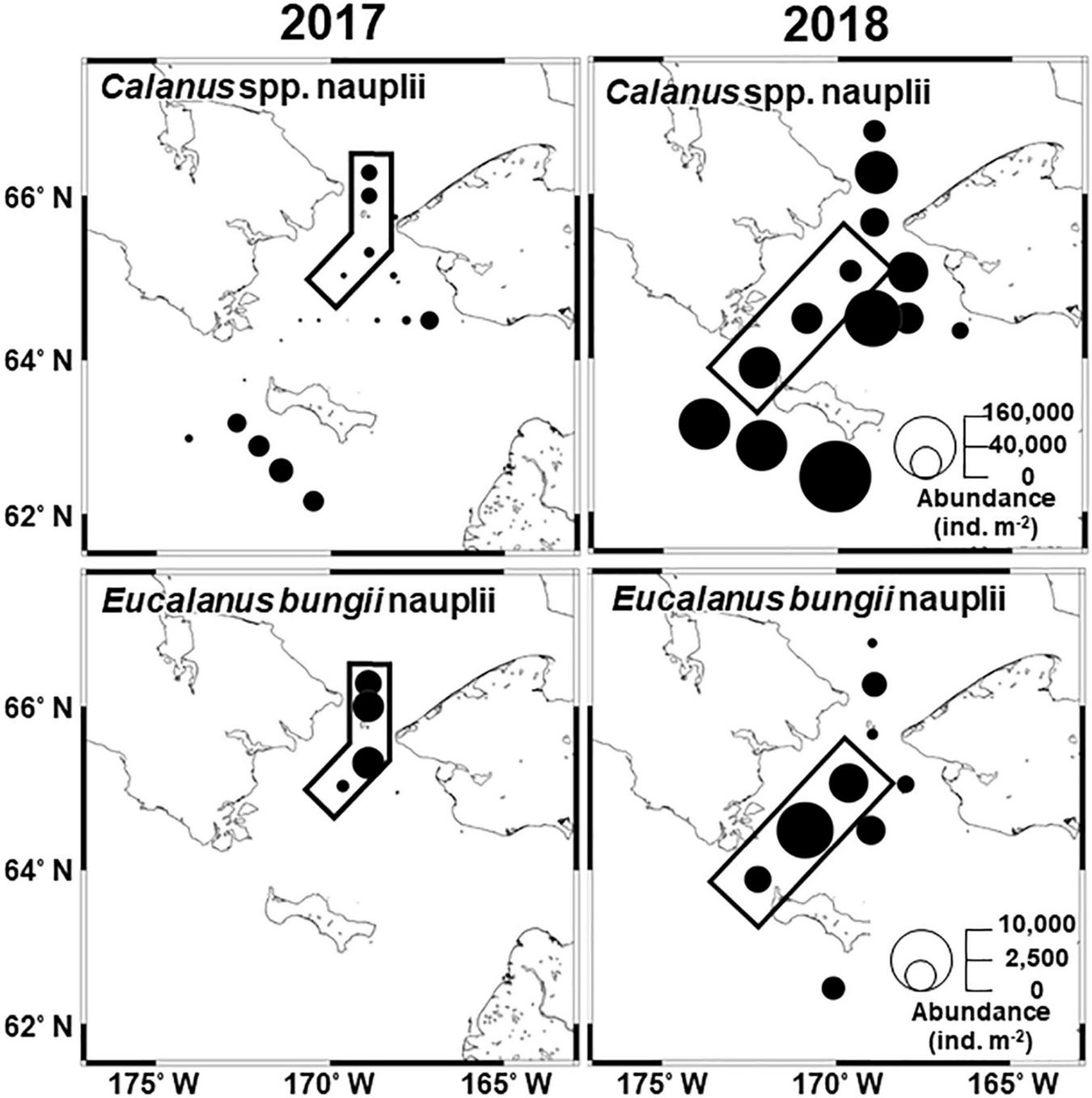 Our study thus investigated the zooplankton community and population structure of large-sized copepods in the northern Bering Sea during the summers of 2017 (exhibiting a typical sea-ice retreat timing after the winters of 2014 and 2015; Stabeno et al., 2019) and 2018 (extremely early sea-ice retreat). These 2 years were compared to evaluate the effects of phytoplankton bloom delays coupled with an early sea-ice reduction on zooplankton community structures. Additionally, copepod production was estimated using metabolic equations based on body mass and in situ temperature to evaluate the impact of copepod community changes on higher trophic levels.