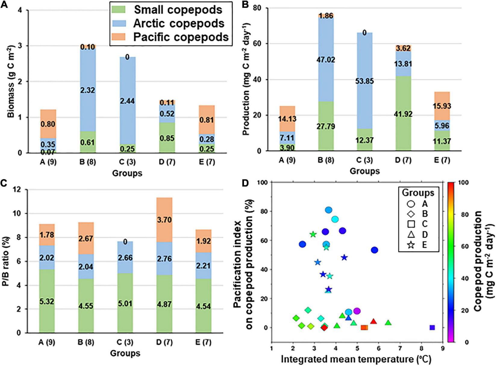Biomass of copepods at each station was estimated by multiplying individual dry weight (mg ind.–1) from references and unpublished data (cf. Supplementary Table 2), abundance (ind. m–2) and a conversion factor 48% from dry weight to carbon biomass (Kiørboe, 2013). Then, we classified C. glacialis/marshallae as Arctic copepods, and E. bungii, N. cristatus, N. flemingeri, N. plumchrus, M. pacifica as Pacific copepods, and the other copepods (cf. Table 2) as small copepods.